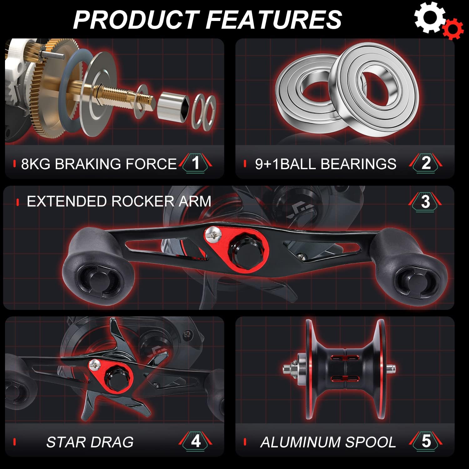 • Innovatives Design: Die Sougayilang MAX Low Profile baitcast rolle verfügt über einen mattschwarzen Körper mit schwarzem Griff und roten Linien Akzente für einen stilvollen Look, eine gute Wahl für Ihre nächste Rolle.
