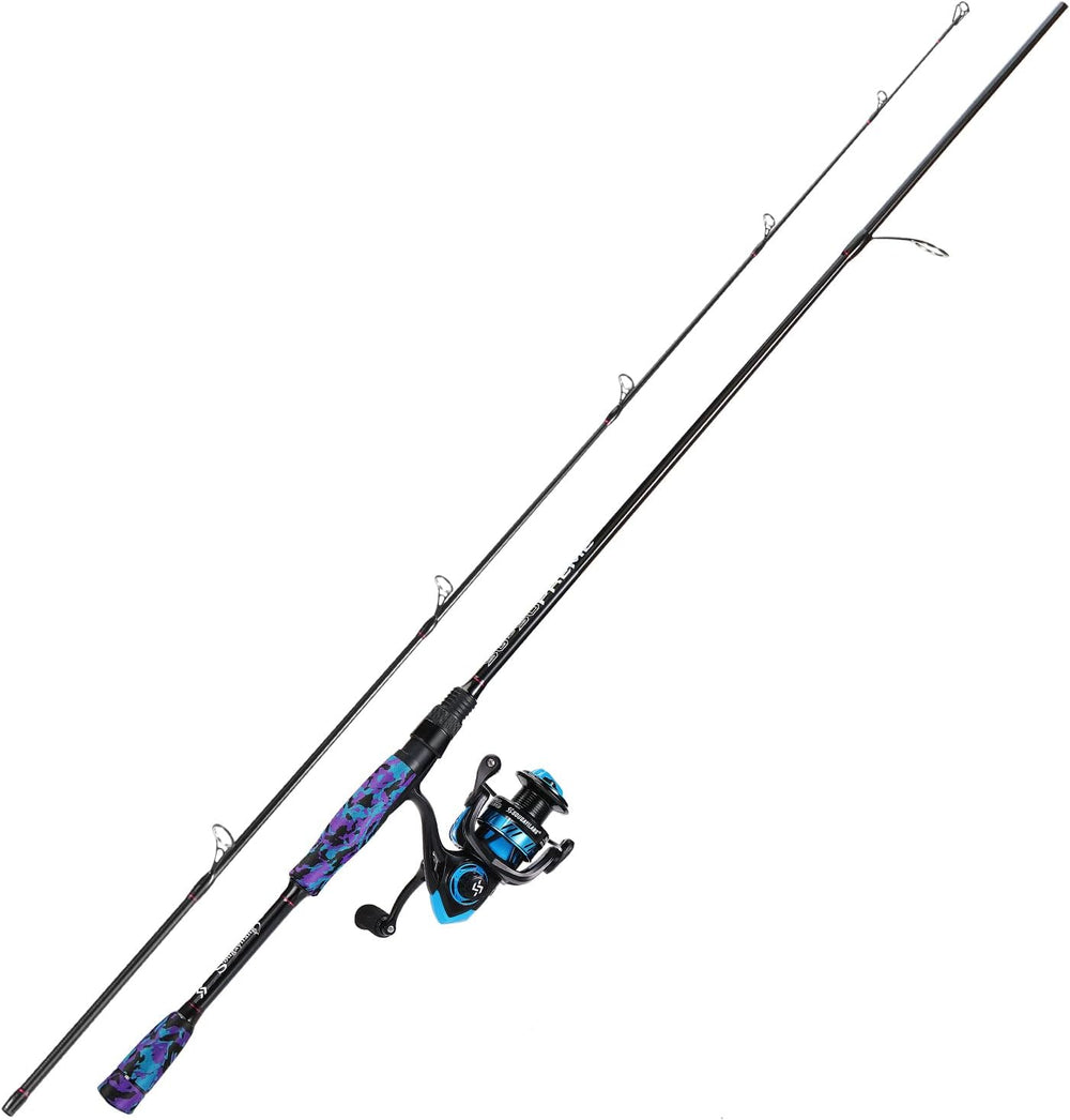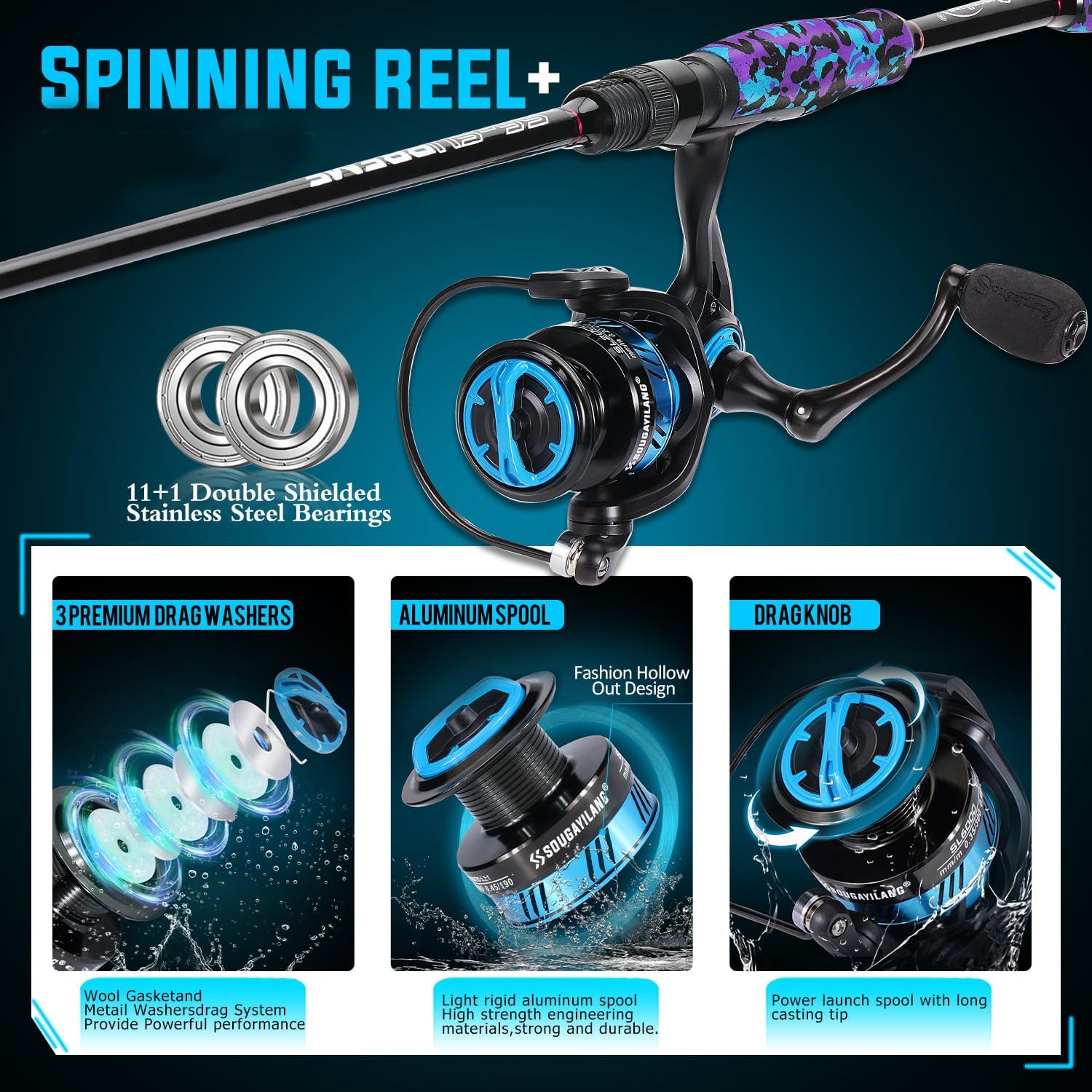 - Dieses Angelset besteht aus einer Spinnrute mit einer leistungsstarken Kohlefaserverarbeitung und bequemen weichen EVA-Griffen. Die Angelrolle hat eine CNC-gefräste Aluminiumspule, einen kraftvollen Aluminiumgriff und eine einstellbare Frontbremse.