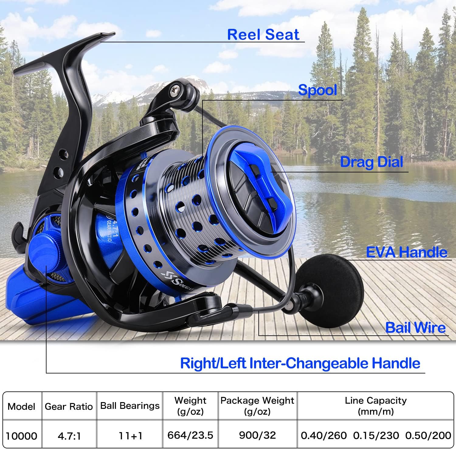- Leistungsstark und stark – das verstärkte Gesamtdesign verfügt über ein verbessertes CNC-Messing-Hauptgetriebe und Messingritzel, das genug Kraft bietet, um die grössten Salzwasser- und Süsswasserfische zu bewältigen. Grössere