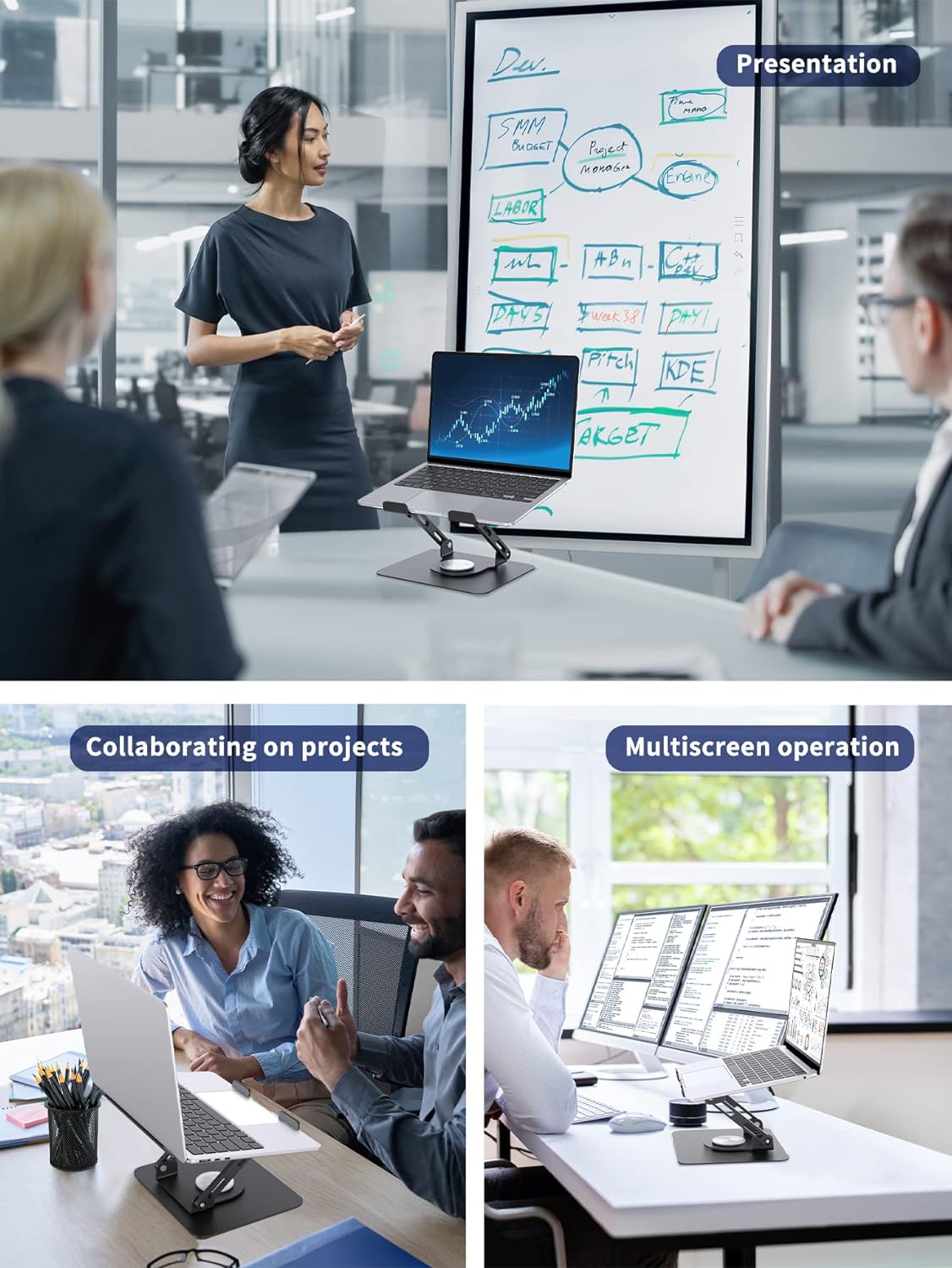 - Mit Leichtigkeit zusammenarbeiten: Der SOUNDANCE Laptopständer verfügt über eine um 360 ° drehbare Basis, wodurch es einfach ist, Ihren Computerbildschirm mit anderen zu teilen, während Sie an Projekten zusammenarbeiten.