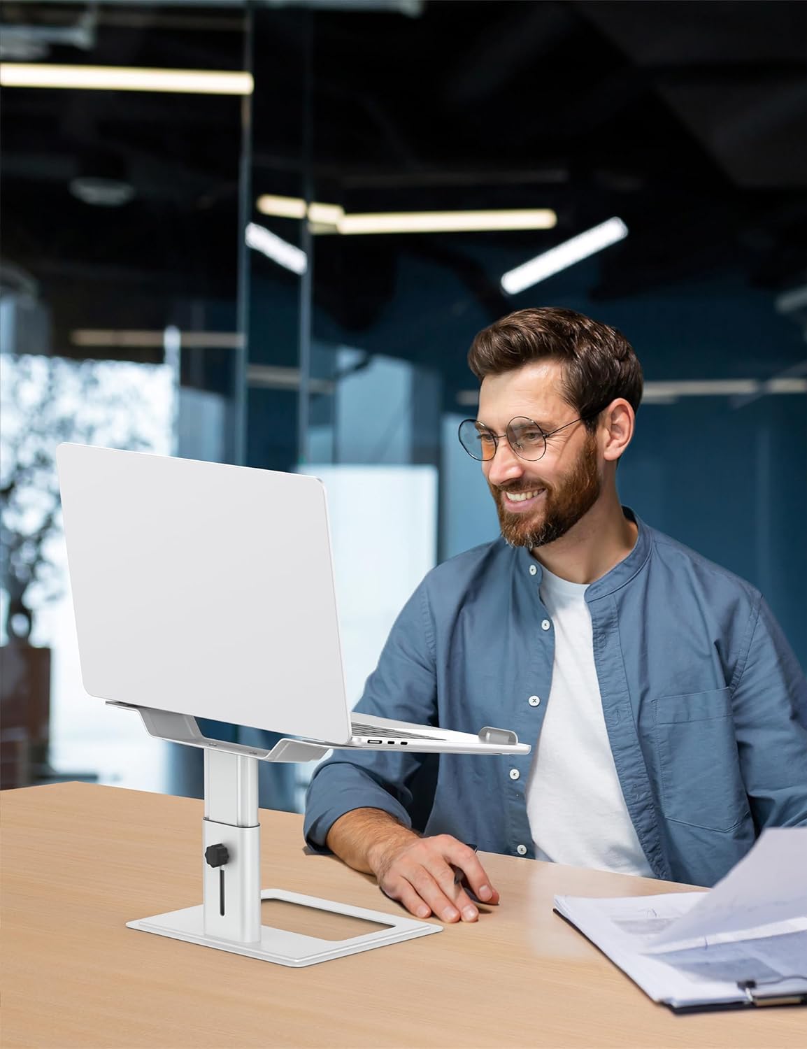 - Höhenverstellbar – Du kannst den Laptop-Ständer je nach Bedarf höher oder niedriger einstellen. Er hält deinen Laptop hoch, so dass du mehr Platz auf dem Schreibtisch für deine Tastatur, Maus, Unterlagen und andere Büroartikel hast.