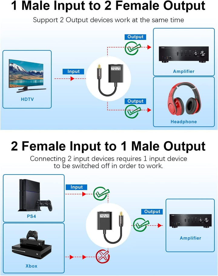 - 💎🧡 【Bitte beachten Sie】Der optische Audio-Splitter wird von 1 Quelle an 2 Empfänger angeschlossen, er kann gleichzeitig arbeiten. Wenn der optische Kabelsplitter 2 Eingänge zu 1 Ausgang ist, müssen Sie einen der Eingänge ausschalten und