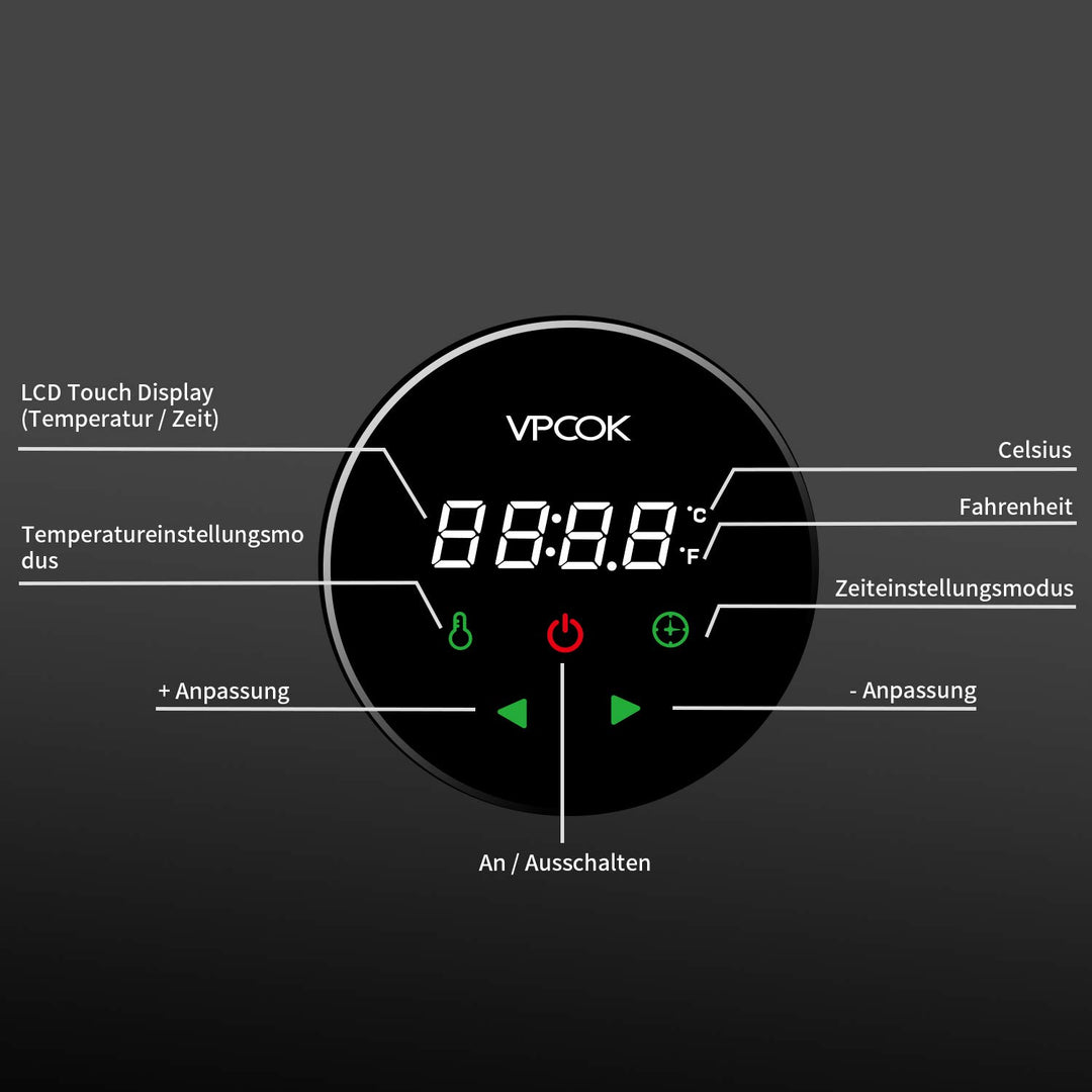 - Intelligente Digitalanzeige:Sous vide ist mit LCD-Flüssigkristallanzeige, intuitive Anzeige. Intelligente Touchscreen-Steuerung, einstellbare Temperatur 25-92,5 ° C, einstellbare Zeit 0-99: 59, bequeme Bedienung und komfortables Berühren