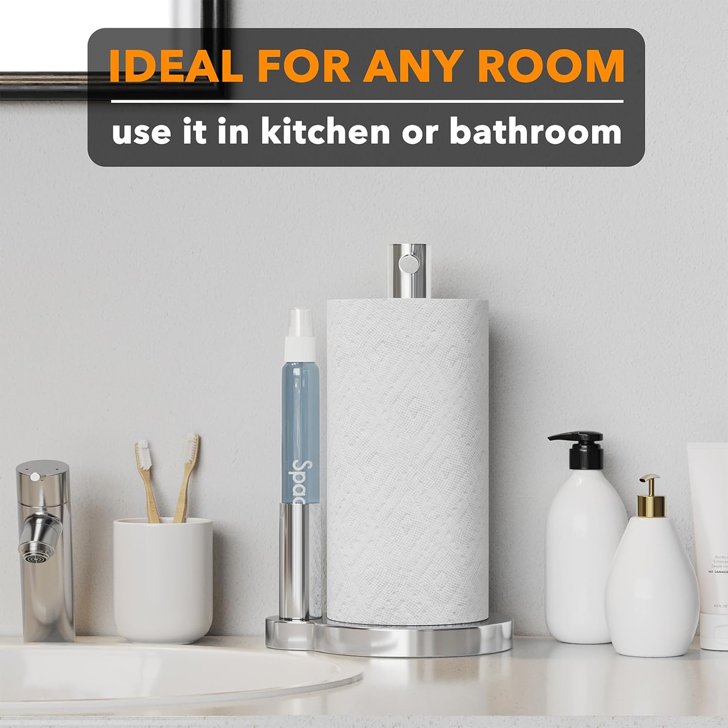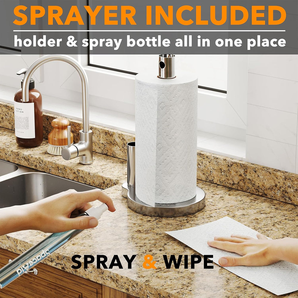 - 2-in-1 Silberfarbener Papierhandtuchhalter – Machen Sie Ihre Küchenarbeitsplatte ordentlich und organisiert mit diesem Papierhandtuchhalter mit Sprühflasche in der Mitte. Sie können einfach sprühen und abwischen. - Masse (L x B x H): 21,6 x 19,5 x