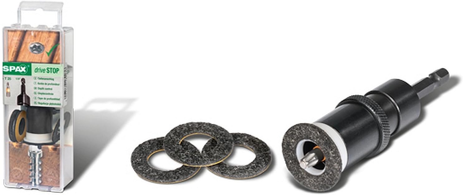 - Lieferumfang: 1 SPAX Drive STOP, variabler Tiefenbegrenzer, 1 Stück SPAX BIT T-STAR plus T25 aus Edelstahl rostfrei und 3 Ersatz Filzringe