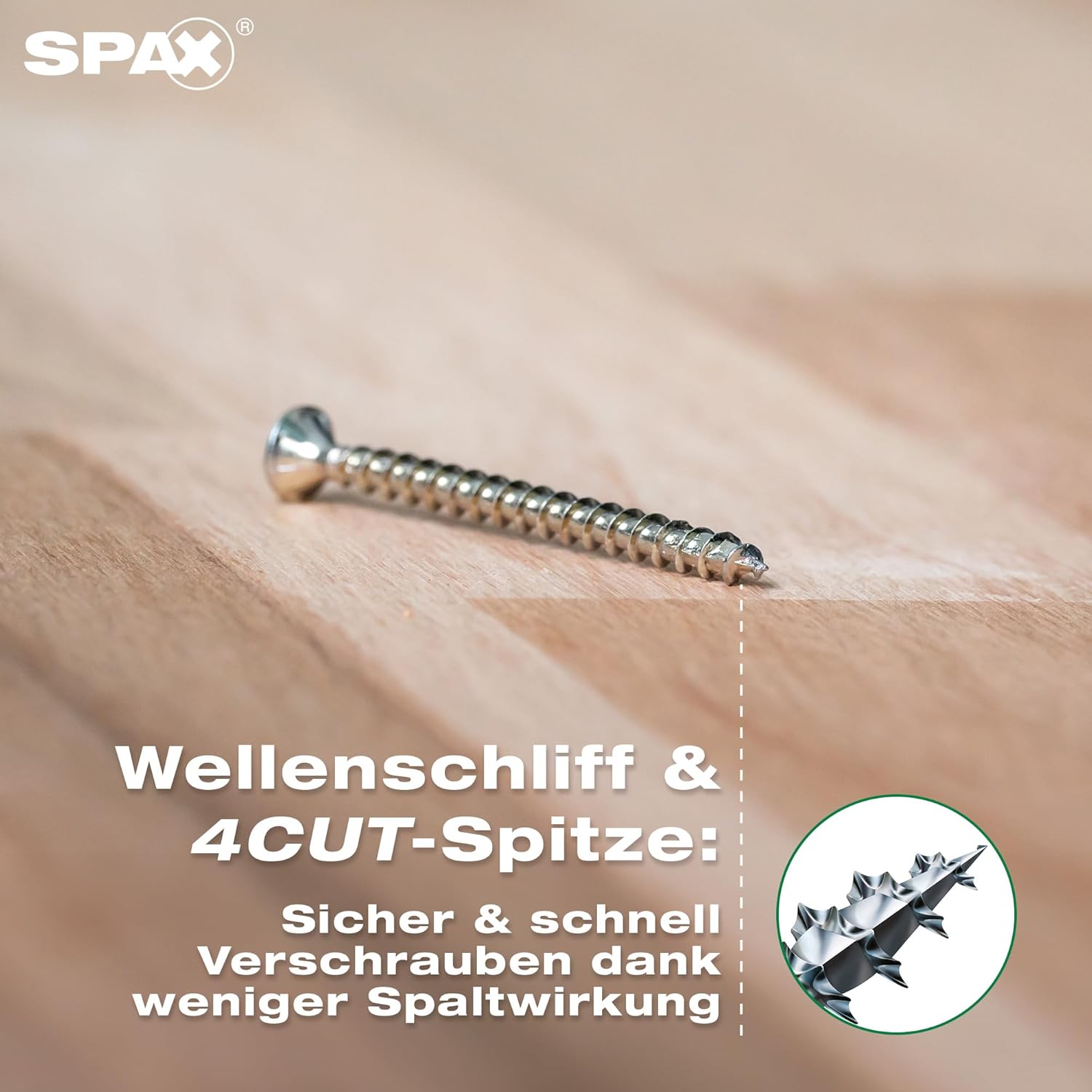 - Energiesparendes Arbeiten: dank der 4CUT-Spitze ist Vorbohren meistens unnötig und die Spaltwirkung wird reduziert. Das wellenförmige Gewinde der SPAX ermöglicht schnelles wie sicheres Verschrauben und spart Akkuleistung.