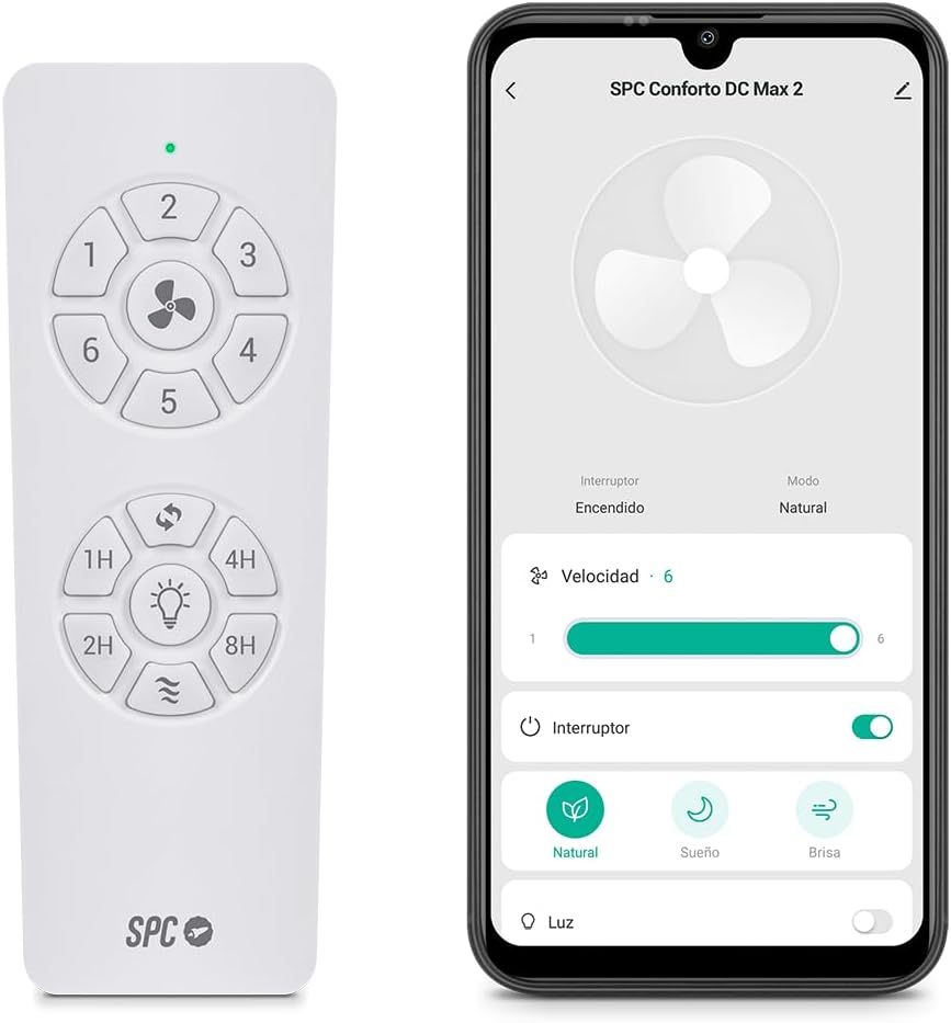 - SPC Conforto DC Max 2 Deckenventilator mit dimmbarem Licht, Motor DC 43 W, super leise und effizient, energiesparend, Ø 132 cm, WiFi für App-Steuerung, Fernbedienung und Winter-/Sommer-Modus