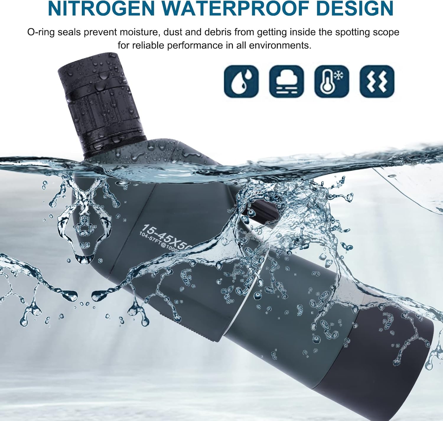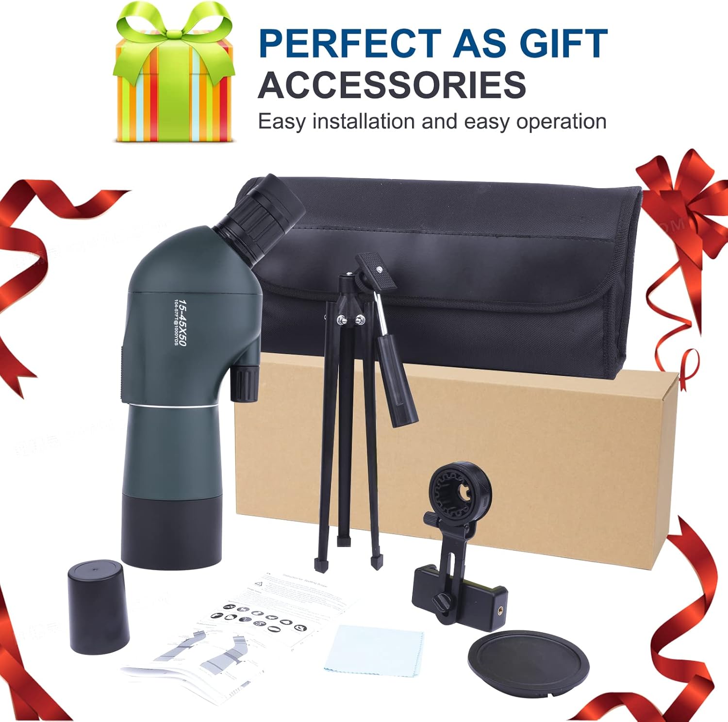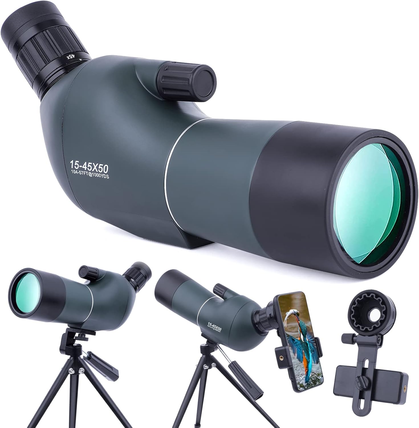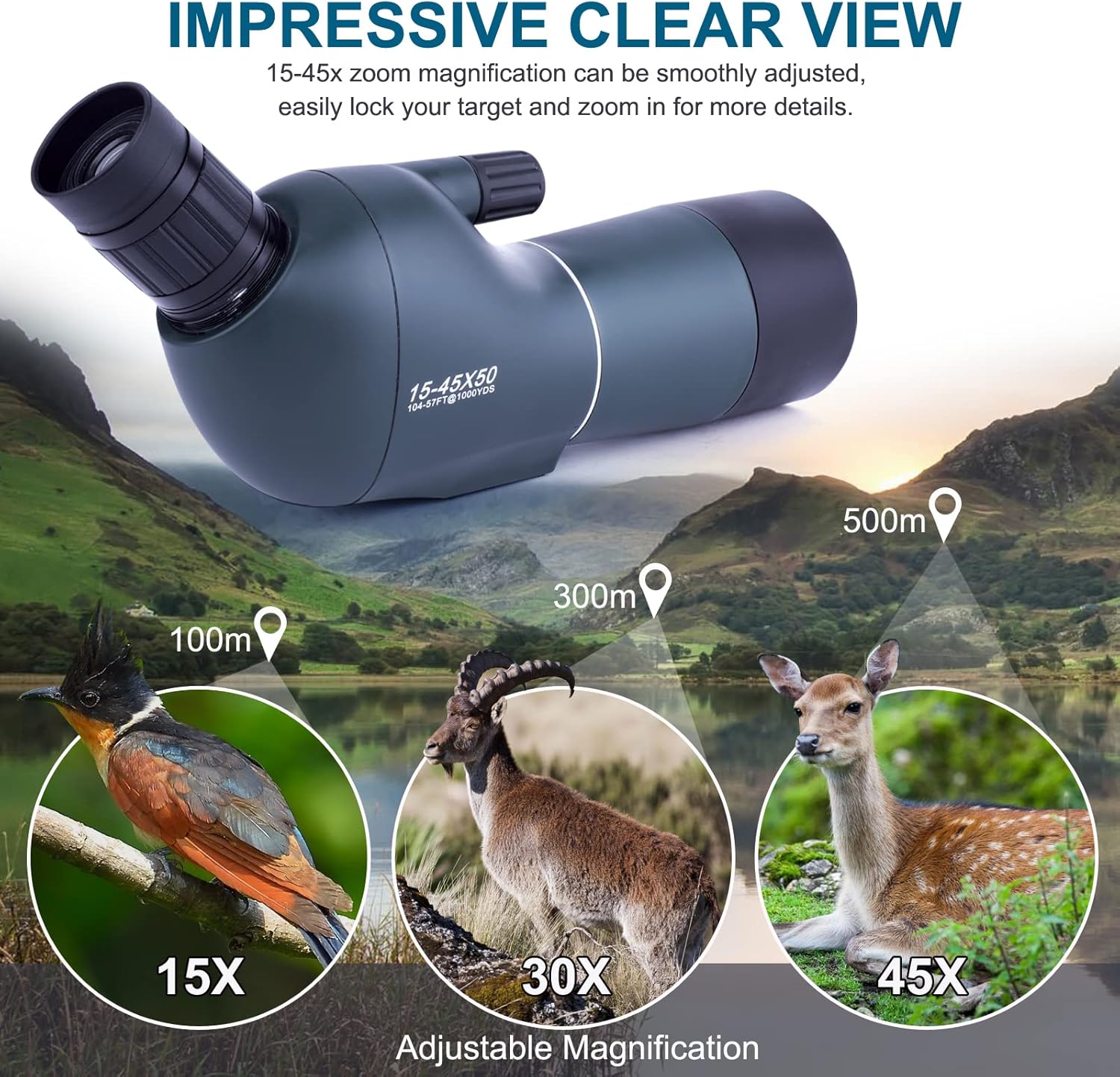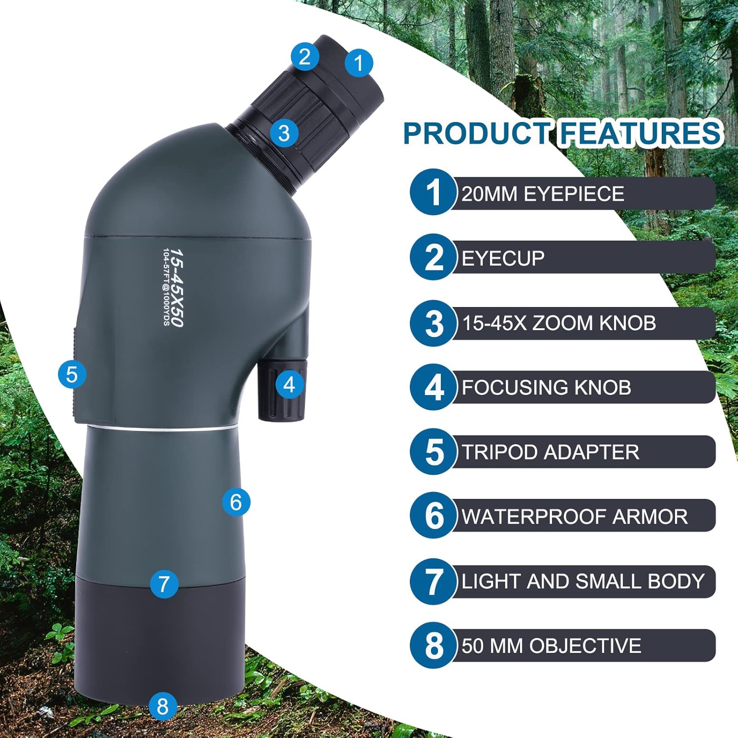 - Leistungsstarkes, einstellbares Spektiv mit 15- bis 45-facher Vergrösserung und dynamischem 50mm Fokussiersystem für Objektivlinsen, mit dem Sie Ihr Ziel einfach vergrössern können. Das komfortable, ergonomische Design des geneigten Okulars bietet