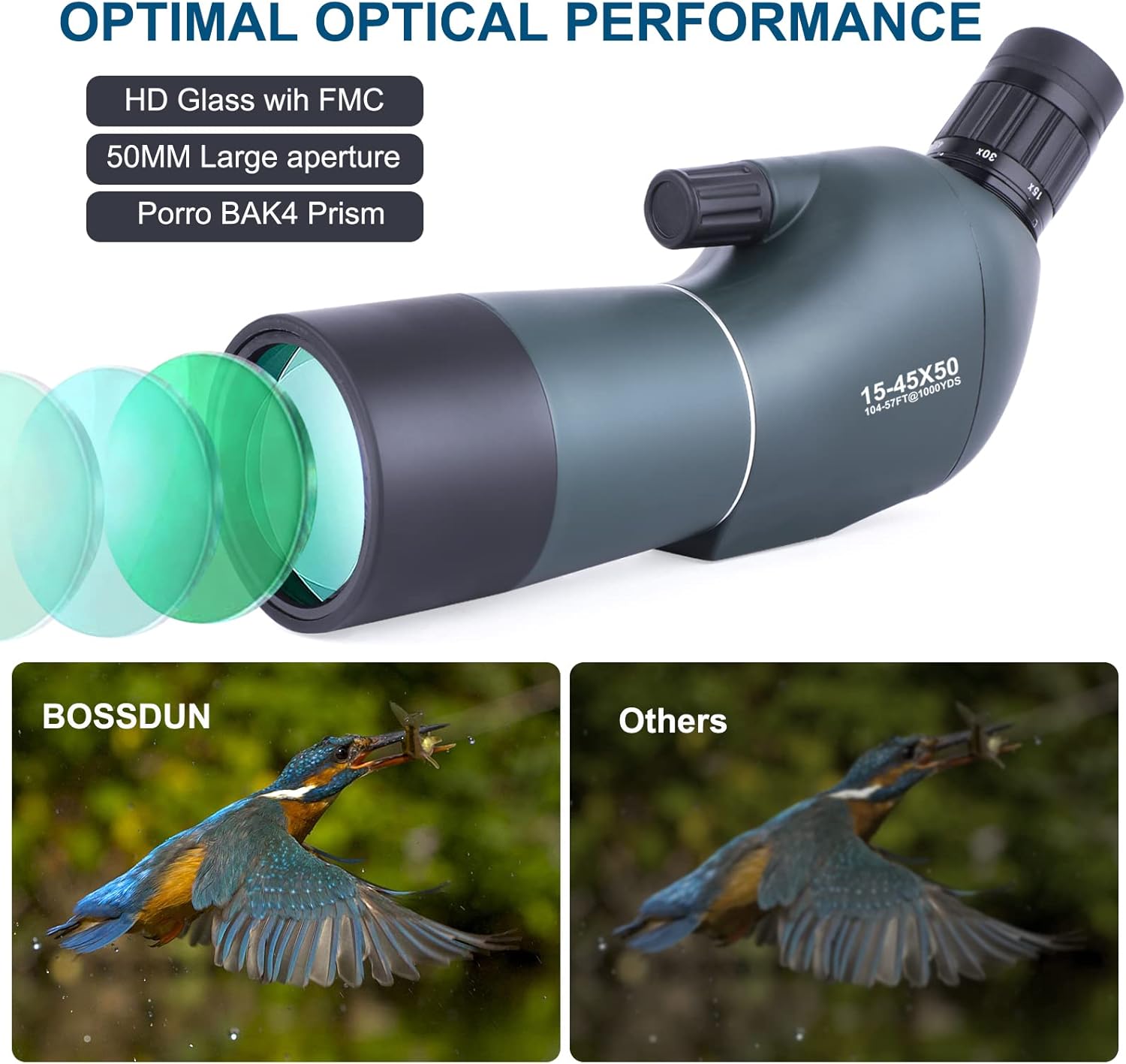 - Die vollständig hochwertige, mehrfach beschichtete 50mm Objektivlinse bietet ein breites Sichtfeld. Die hochwertige BAK4-Porro-Prismenoptik im Spektiv 15-45x50 erhöht die Lichtdurchlässigkeit und liefert helle und scharfe Bilder. Dadurch wird Ihre