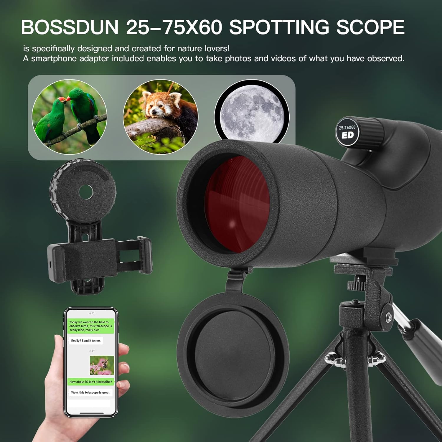 - 【60 mm Grünfilm-Objektivlinse & vollständig mehrfach beschichtet】Grössere Objektivlinse für hellere Bilder. BOSSDUN Spektive haben eine sehr leistungsstarke 60-mm-Objektivlinse, um viel Licht und grosse, klare Bilder zu liefern. Der grüne Film