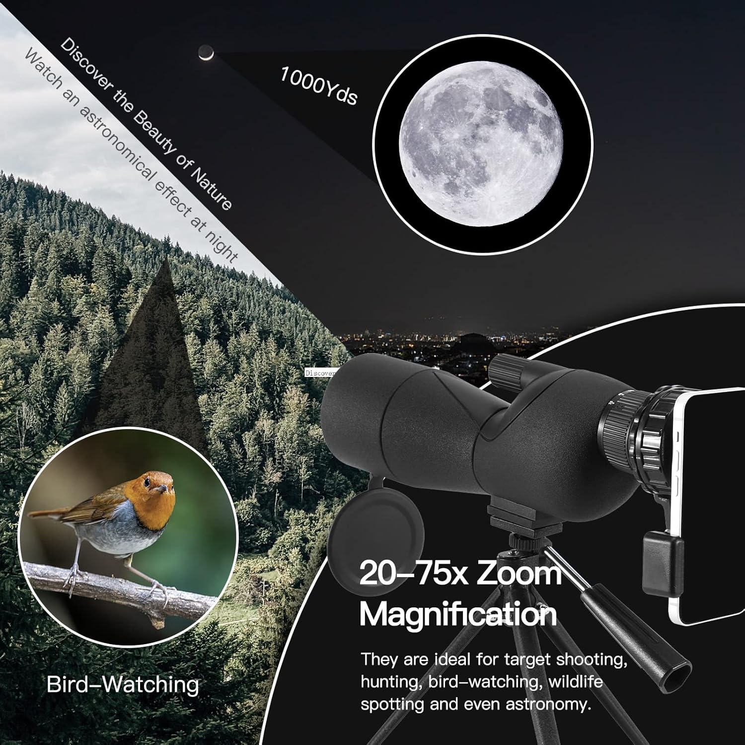 - 【25-75-fache Zoom-Vergrösserung mit einziehbarer Augenmuschel】Zoomobjektiv ändern die Vergrösserungsleistung von 20x auf 60x über den Zoomring. Verstellbarer Augenabstand von 14,5 - 15 mm ist sehr bequem. Sie sind ideal für Zielschiessen, Jagd,