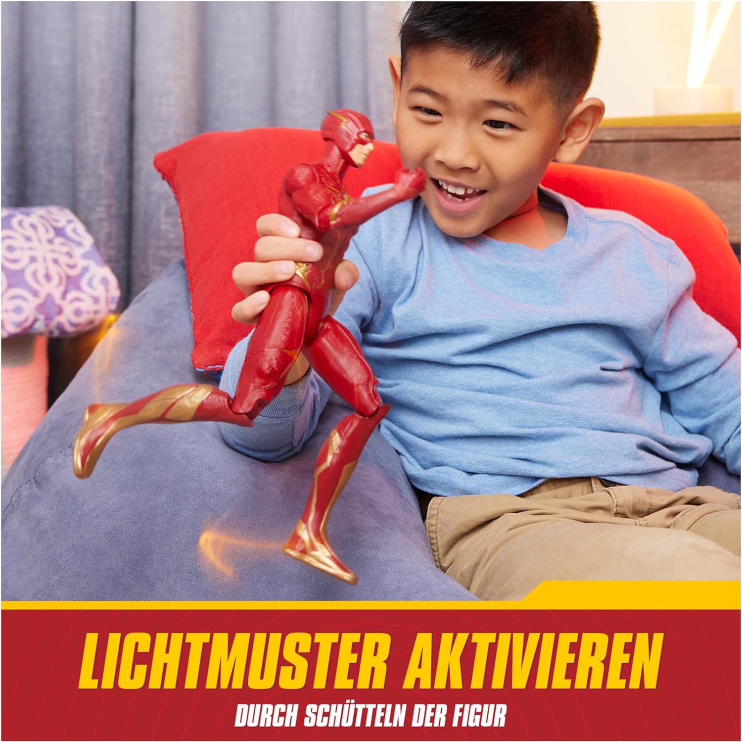 - Einfach auf das Logo auf der Brust der Flash-Figur drücken oder die Figur schütteln, um die übernatürlichen Lichtmuster auf seinem Körper und mehr als 15 Geräusche zu aktivieren.