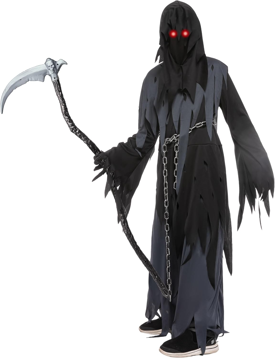 - JUNGEN SENSENMANN KOSTÜM. Unser Sensenmann-Kostüm für Mädchen enthält 1 Kleid, 1 Umhang mit Kapuze, 1 Metallkette, 1 Paar schwarze Handschuhe, 1 Gesichtsmaske, 1 Paar leuchtende Augen.