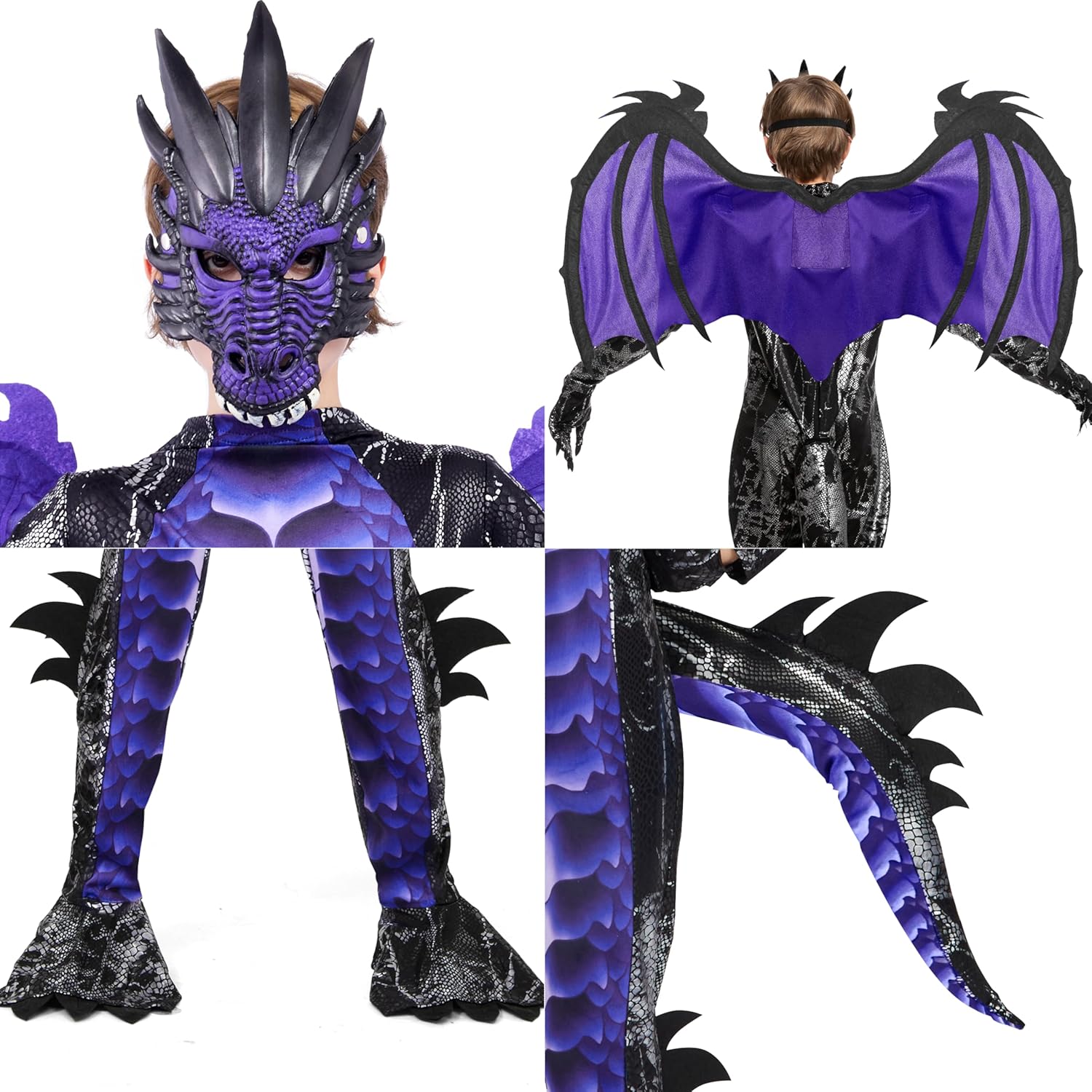 - Vorteilspaket: Dieses violette dunkle Drachenkostümset enthält 1 Drachenoverall, 1 Schwanz, 1 Paar Handschuhe, 1 Maske und 1 Paar abnehmbare Flügel. Die Drachenmaske und die Handschuhe geben Ihrem Kind das volle Drachenerlebnis, während der Schwanz