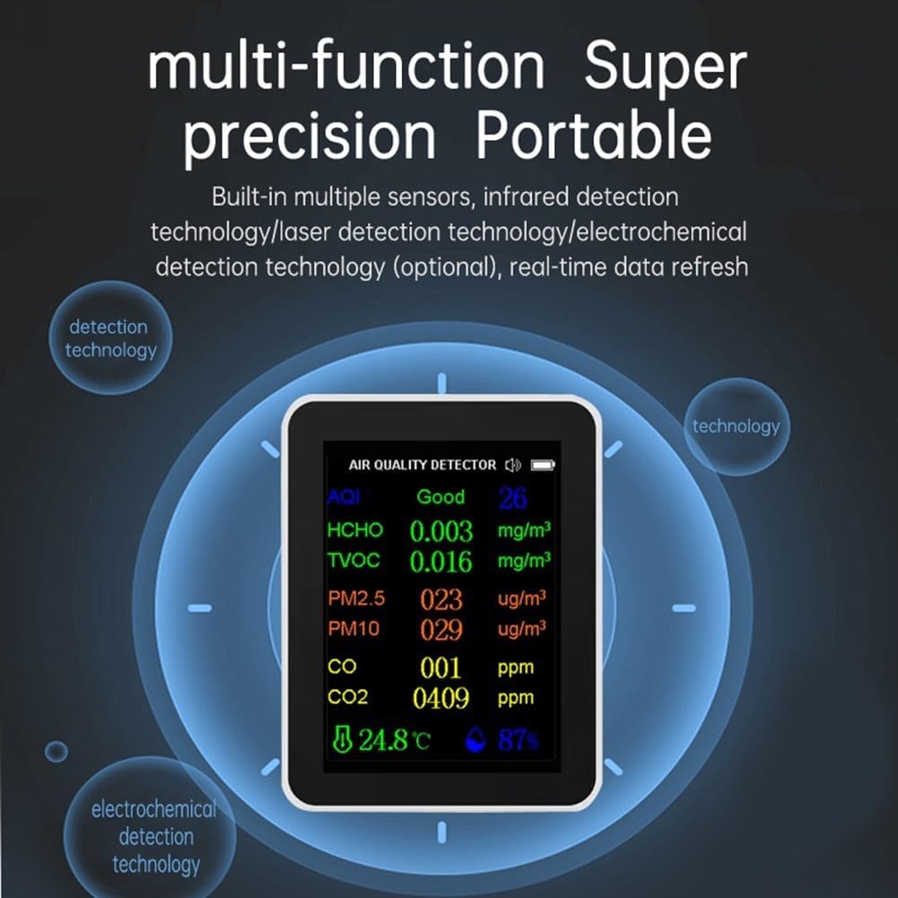 - 【10-in-1-Luftqualitätserkennung】 Erkennt und zeigt gleichzeitig Konzentrationen von PM5, PM10, HCHO, AQI, Temperatur und Luftfeuchtigkeit an.