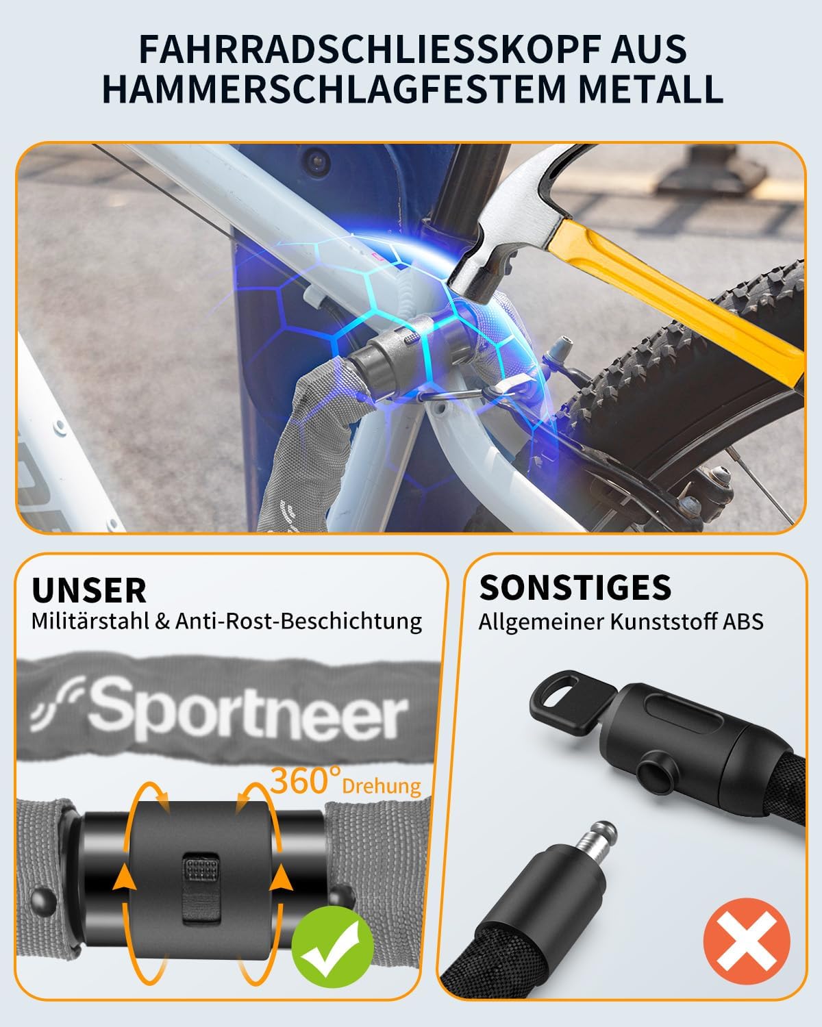 - METALLSCHLOSSKOPF: Sportneer hat den Schlosskopf von allgemeinem ABS-Kunststoffmaterial zu hammerfestem Metallmaterial mit Anti-Rost-Beschichtung aufgerüstet, wodurch das Fahrradschloss widerstandsfähiger gegen Hämmern als andere Schlösser auf dem