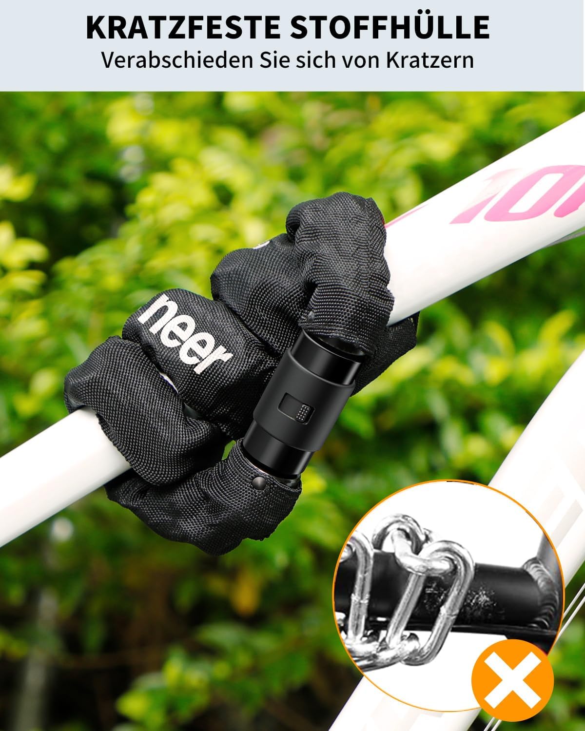 - WEAR-RESISTANT PROTECTIVE COVER: Halten Sie die Fahrradkette für das Schloss mit Schlüssel in gutem Zustand sowie Ihr Fahrrad dank des Vliesstoffs, der korrosions- und abriebfest ist und Kratzer und Absplitterungen an Ihrem Fahrradrahmen verhindert.