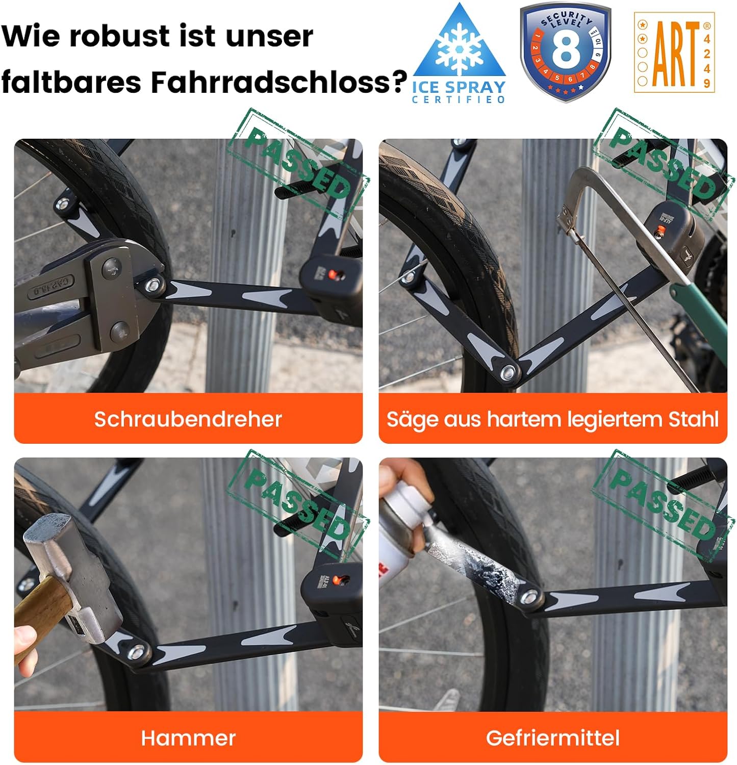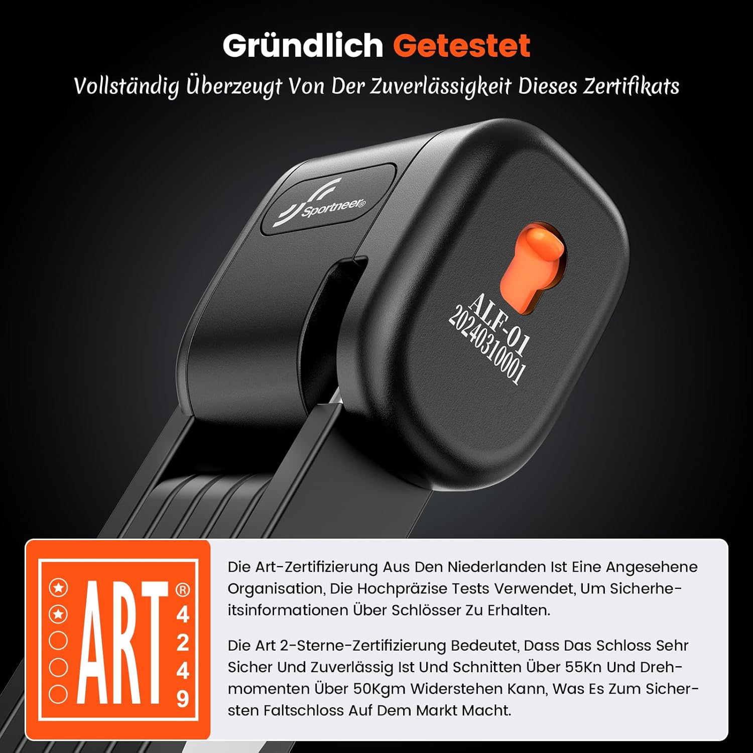 • 【Aussergewöhnliche Sicherheit】Wenn es um die Sicherung Ihres Fahrrads geht, hebt sich das faltbare Sportneer-Schloss von der Masse ab. Es hat die ART 2-Sterne-Zertifizierung (die höchste in dieser Kategorie) erhalten und ist aus einer 65mm