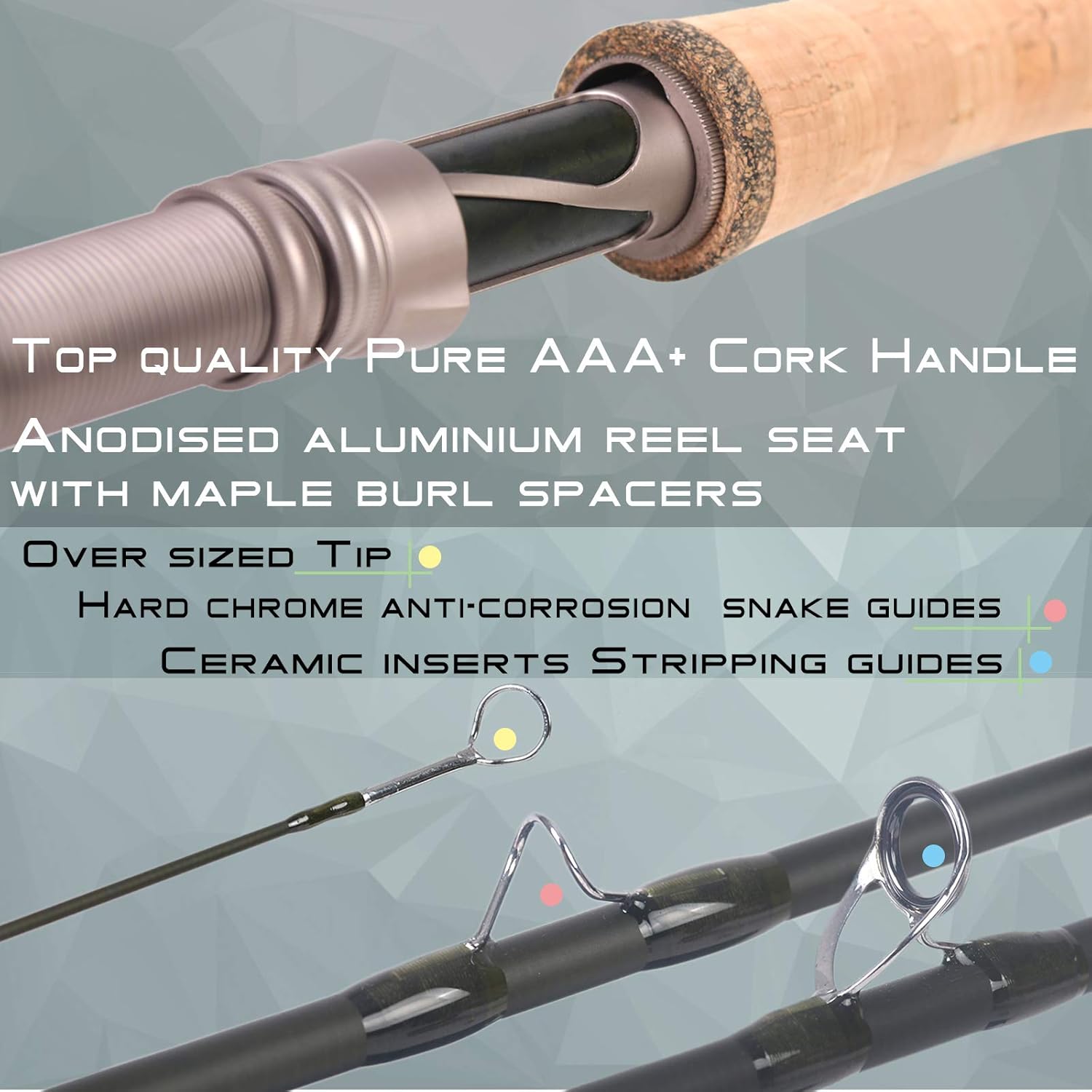 - PURE CORK HANDLE und REEL SEAT - Pure AAA + Cork Handle für bequemes Greifen und auch hilfreich beim Giessen. Rollenhalter aus eloxiertem Aluminium mit Abstandshaltern aus Ahornholz. Und verträgt Salzwasserumgebung.