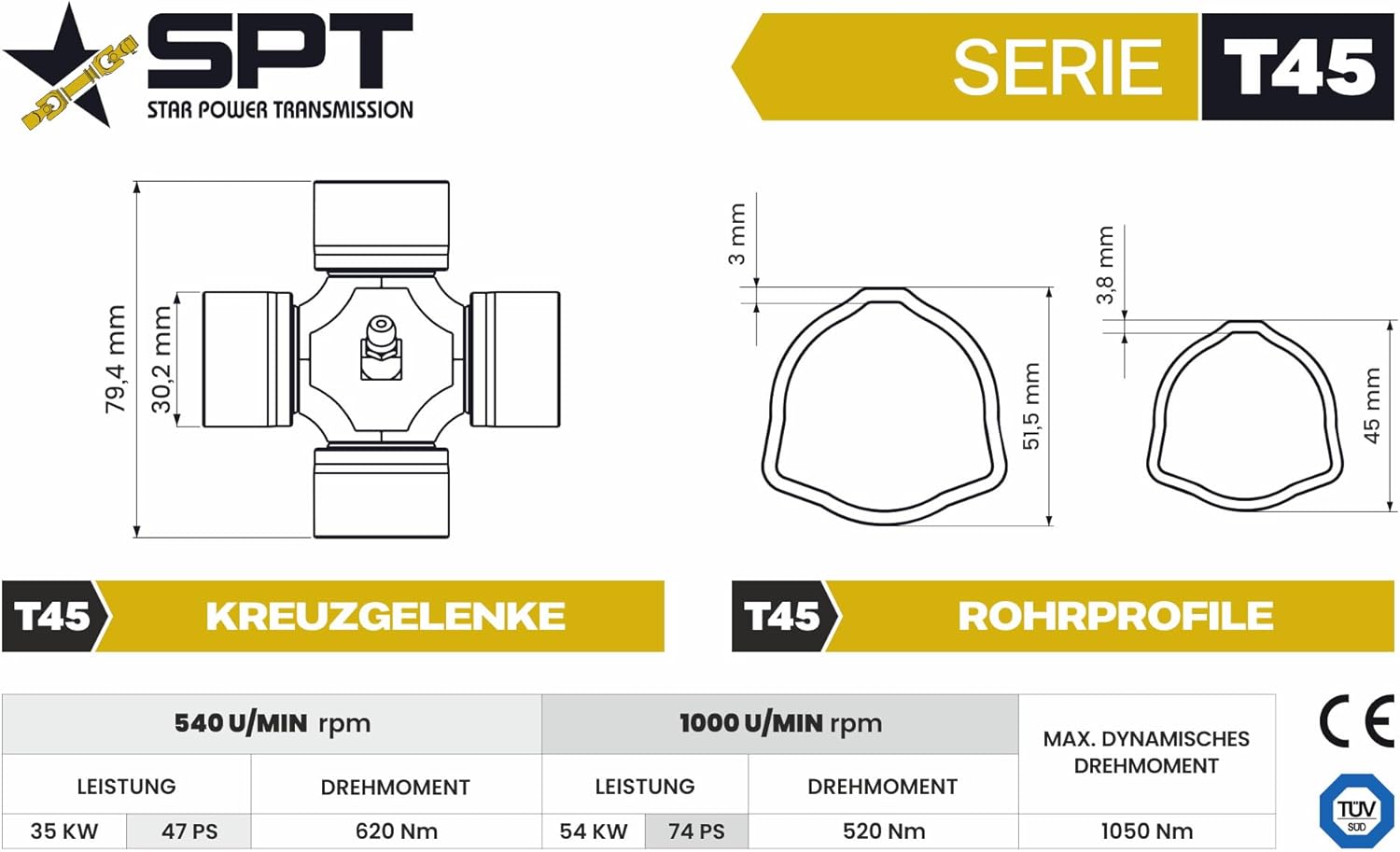 SPT Gelenkwelle mit Scherbolzenkupplung Serie 45 Scherbolzen 2200Nm Zapfwelle 47 bis 74PS 1 3/8" Z6