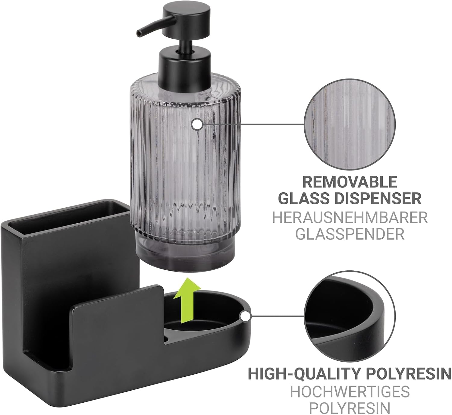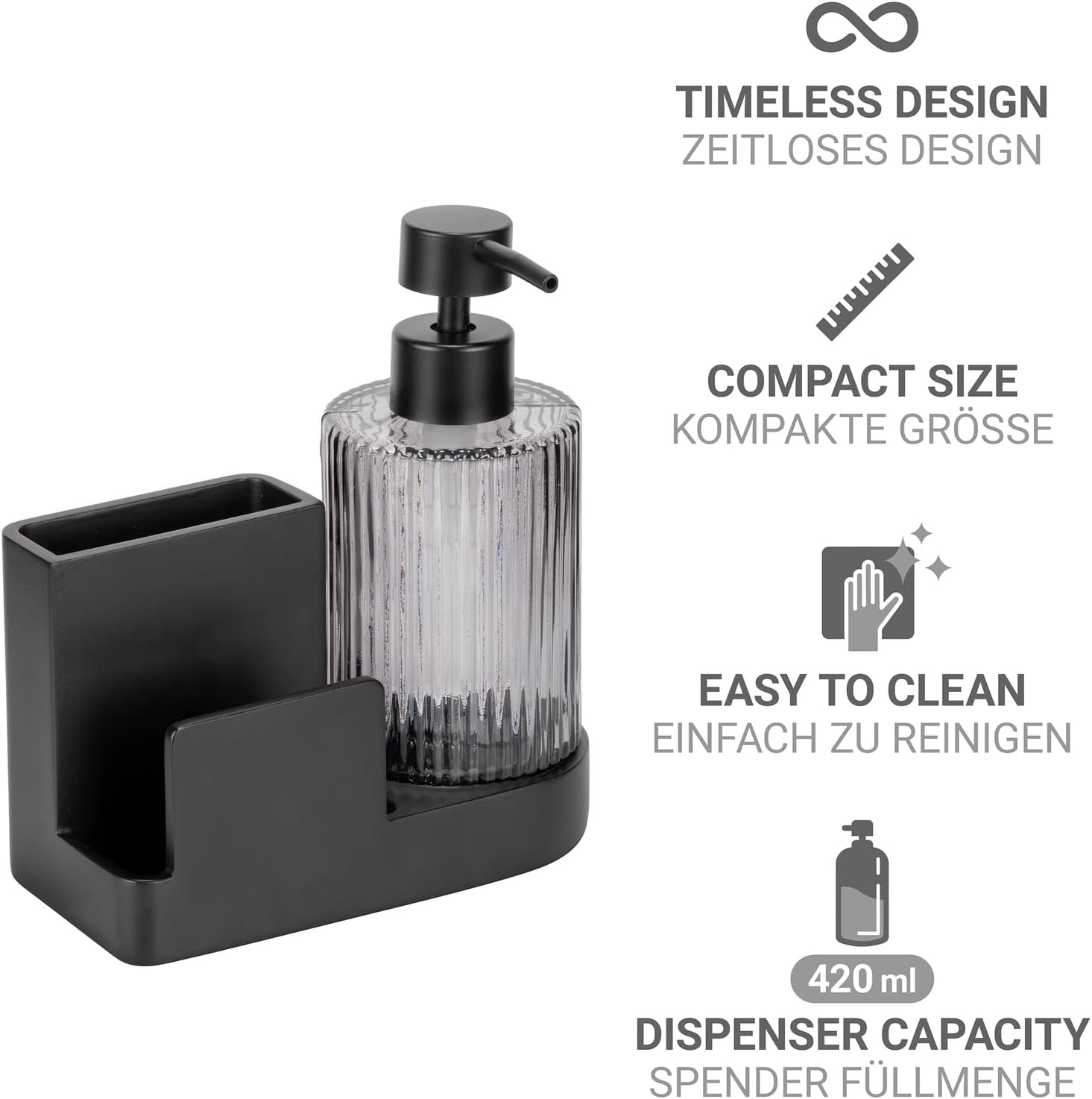 - Inklusive Seifenspender: Herausnehmbarer Glasspender mit 0,42 l Fassungsvermögen - Ideal für Spülmittel oder Seife und problemlos zu befüllen für den täglichen Gebrauch