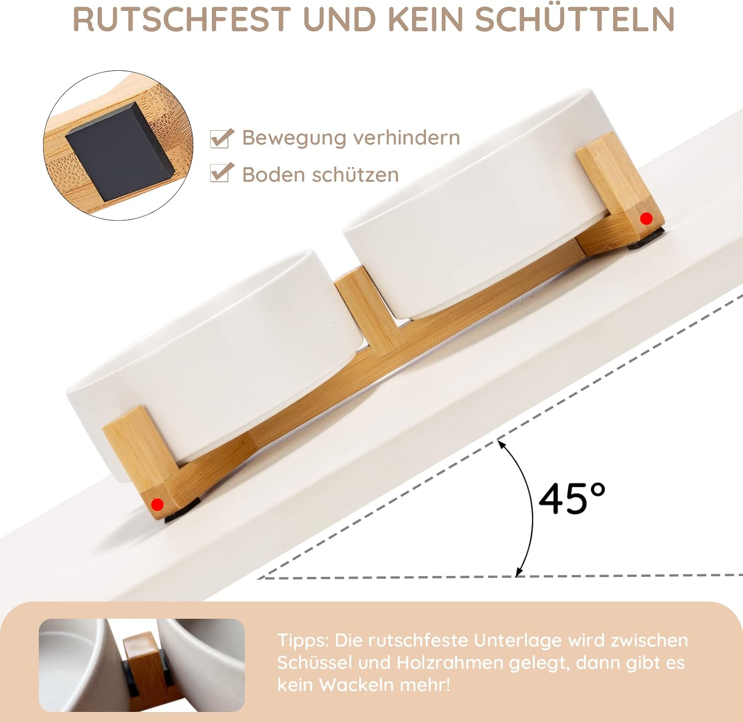- Natürlicher Holzständer: Der einzigartige Holzständer kann das Verschütten von Lebensmitteln wirksam verhindern und den Boden sauber und ordentlich halten. Rutschfester Schüsselboden, der das Aufnehmen und Abstellen erleichtert