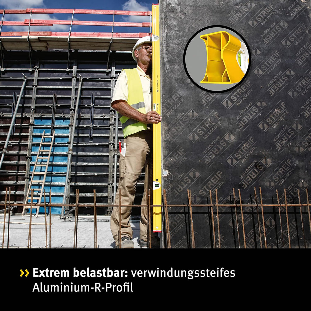 - EXTREM BELASTBAR: Innovatives Aluminium-R-Profil mit zwei beschichteten Messflächen, entwickelt für härteste Baustelleneinsätze. Durchgehender Steg über Horizontal-Libelle stabilisiert zusätzlich das Profil