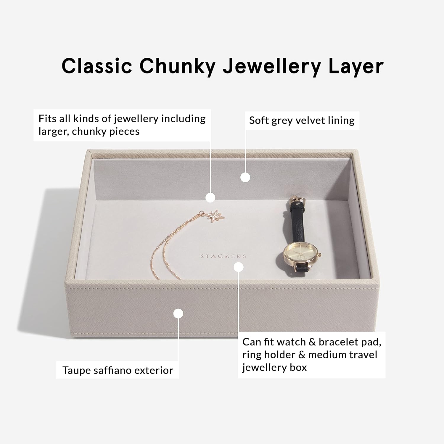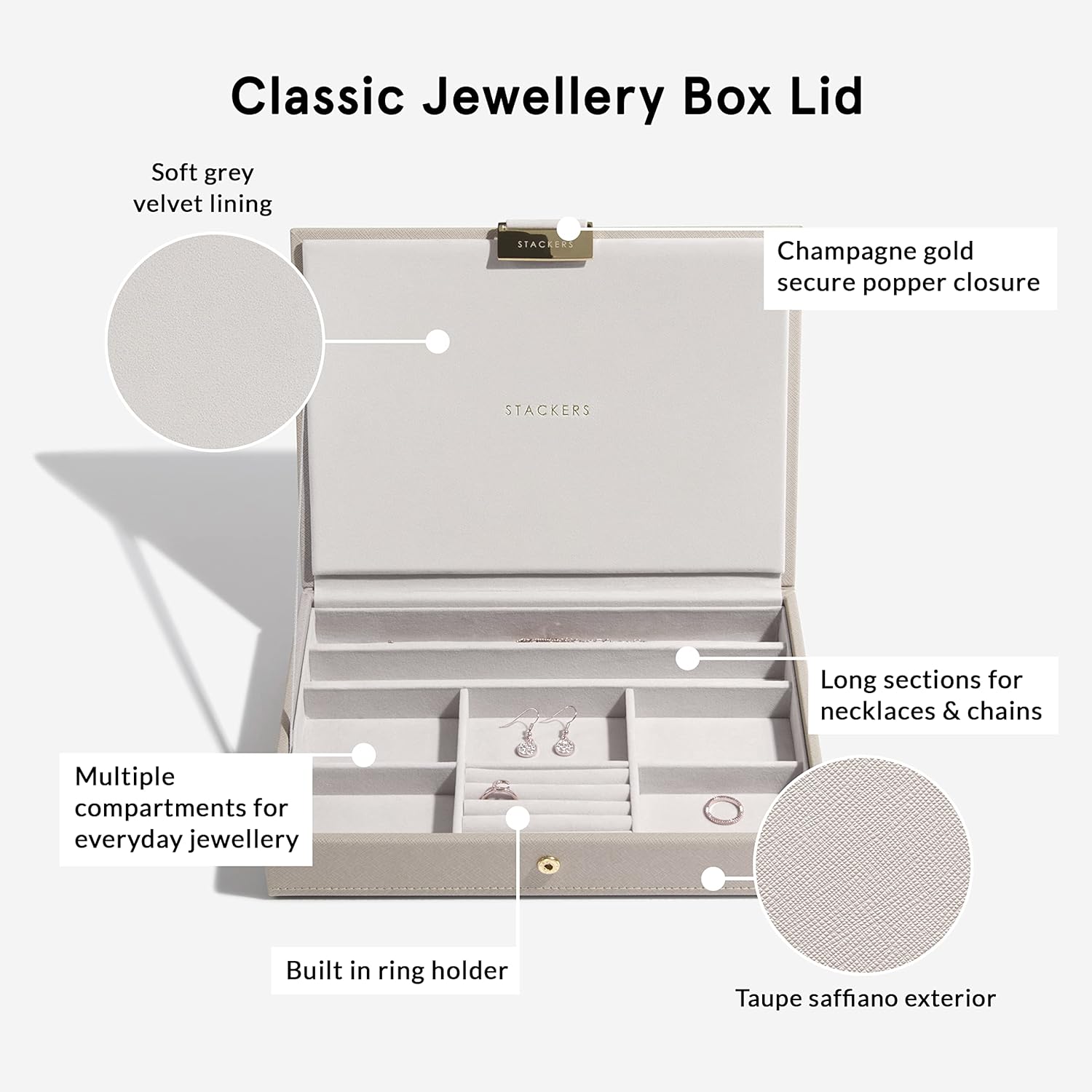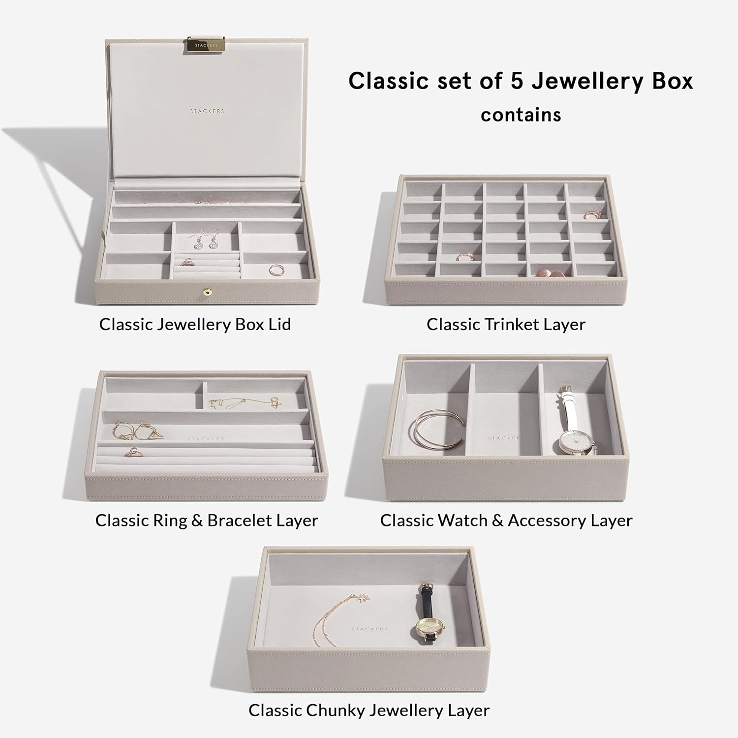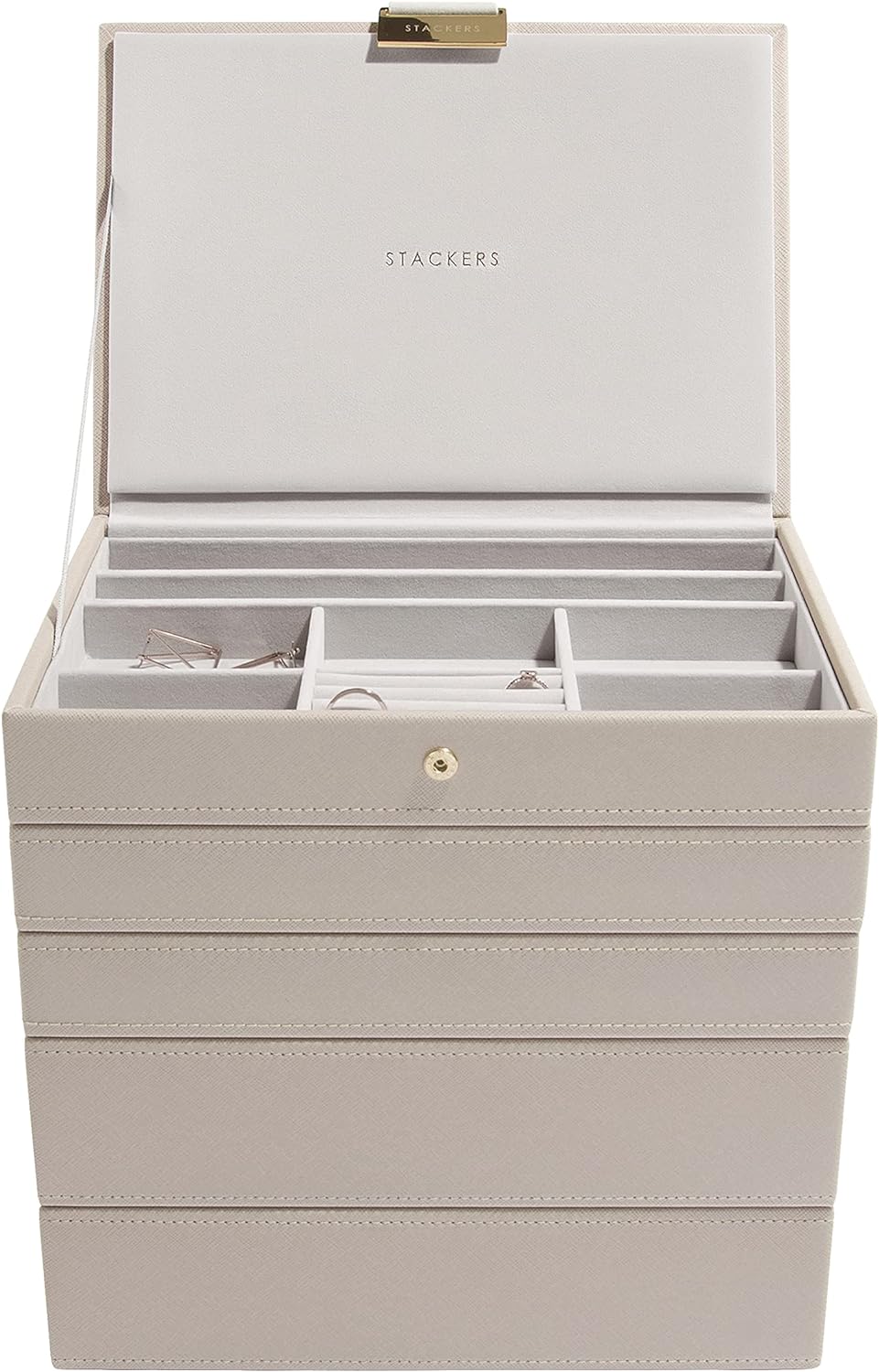 - Diese Schmuckschatulle von Stackers enthält eine Schublade mit Deckel, eine Schublade für Ring- / Armbandteil, eine Schublade mit 25 kleinen Fächern, eine Schublade mit 3 tiefen Fächern und eine grosse, tiefe Schublade.