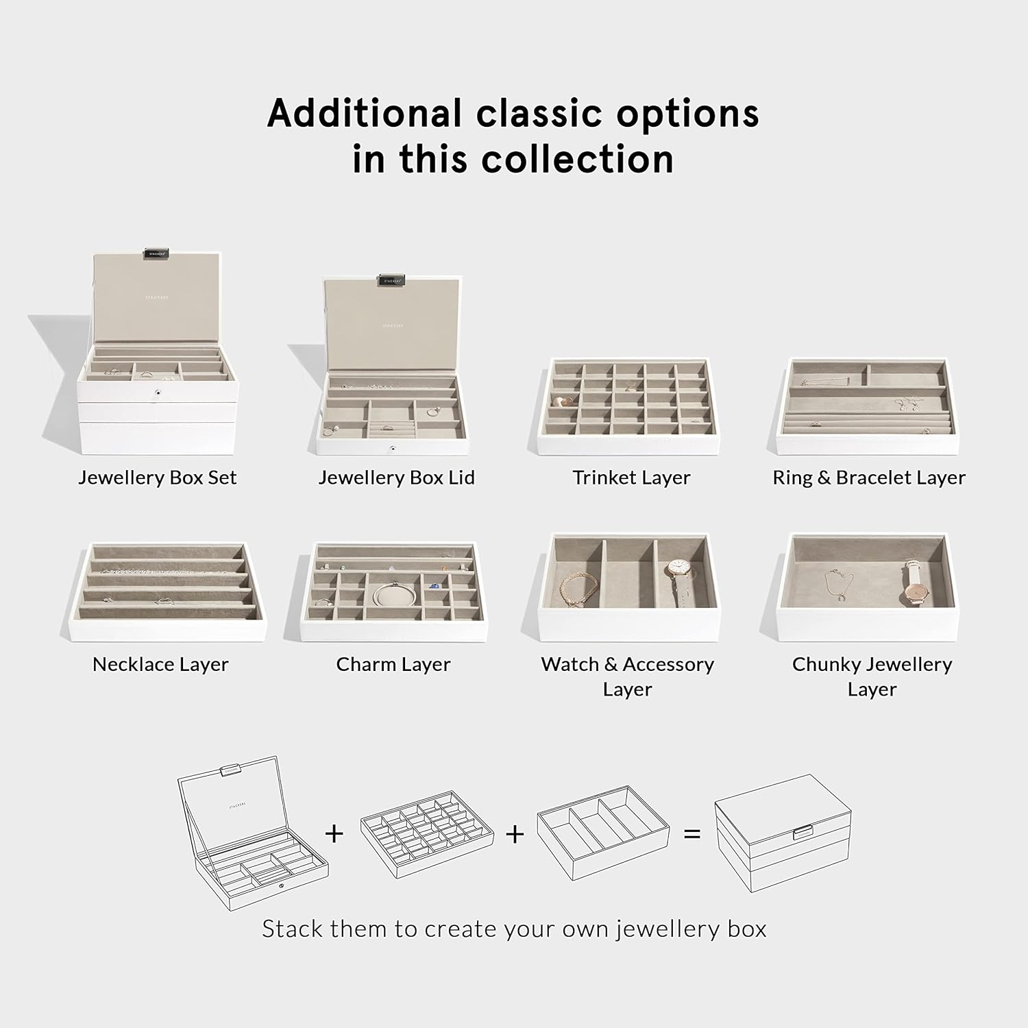 • Stackers: Die Schmuckkästchen sind in 3 Grössen und verschiedenen Farboptionen erhältlich.