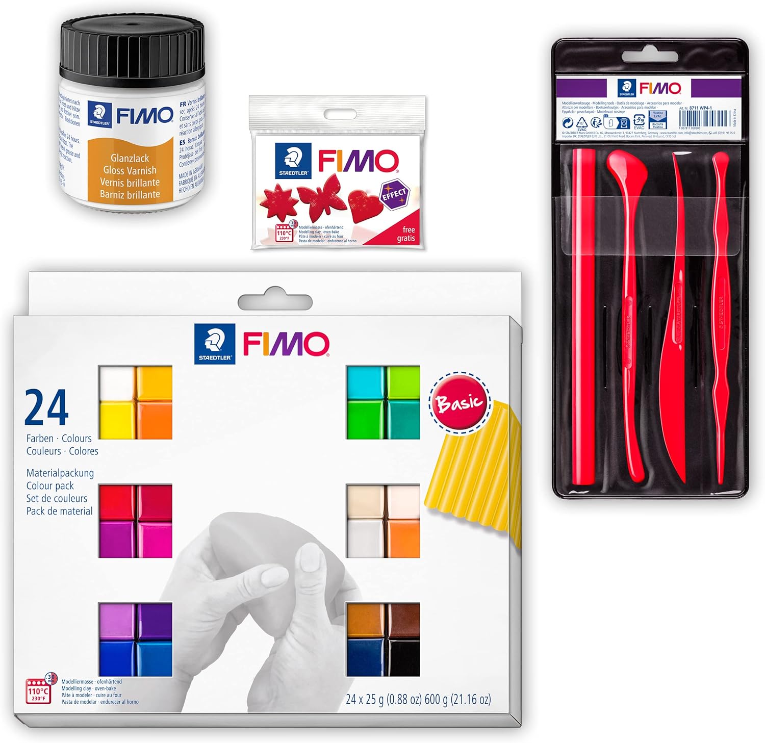 - Lieferumfang: 24 FIMO Halbblöcke á 25g in sortierten basic Farben, 4 Modellierwerkzeuge, FIMO Glanzlack inklusive 1 Halbblock FIMO effect und Ausstechform GRATIS