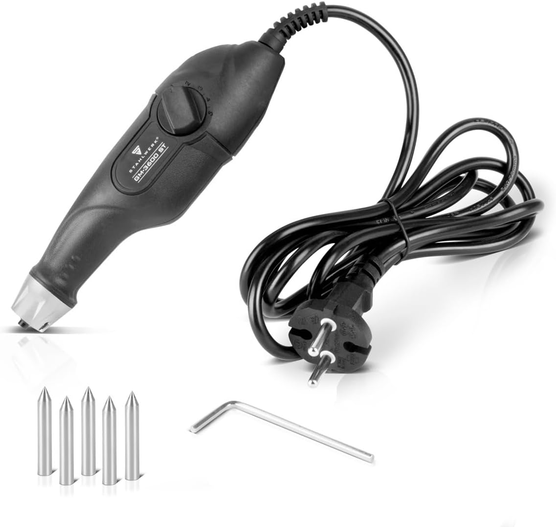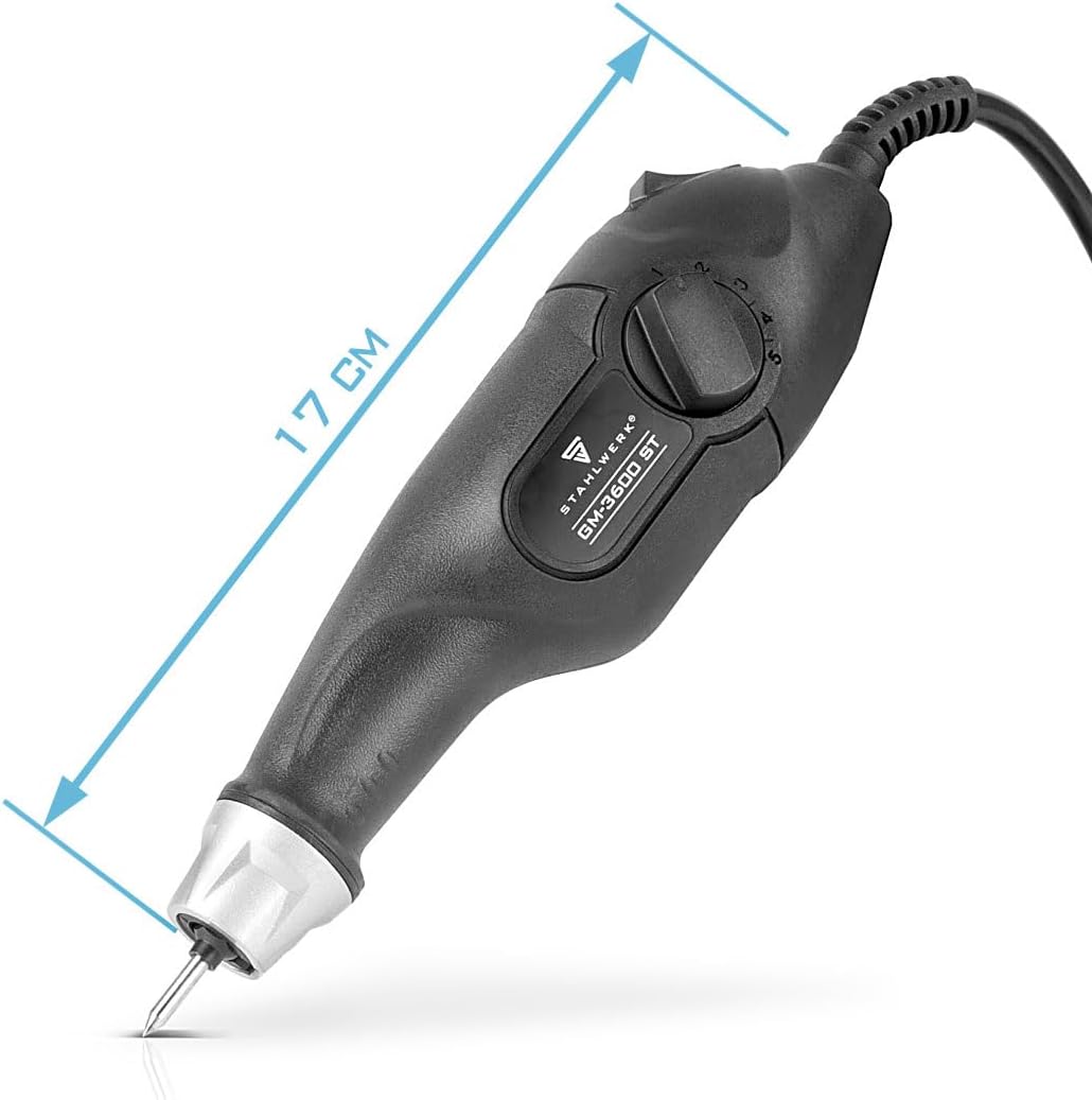 - Der vielseitige STAHLWERK Gravierstift eignet sich mit 24 Watt Leistung und 5 Hubtiefen-Einstellungen bei 3.600 Hüben pro Minute ideal für präzise Graveurarbeiten. Dank der Hubtiefen-Einstellungen können mit dem Graviergerät sowohl feine, als auch