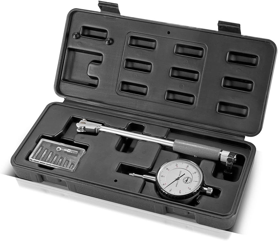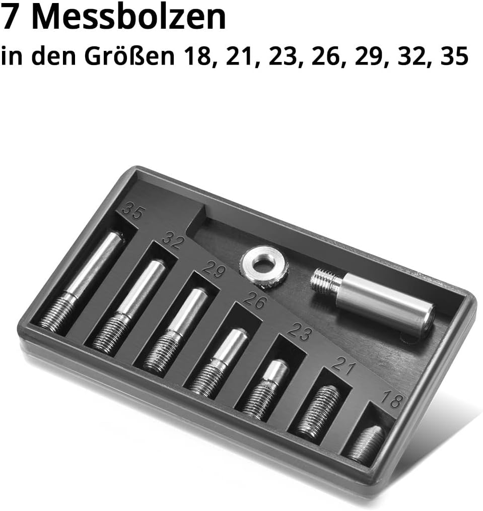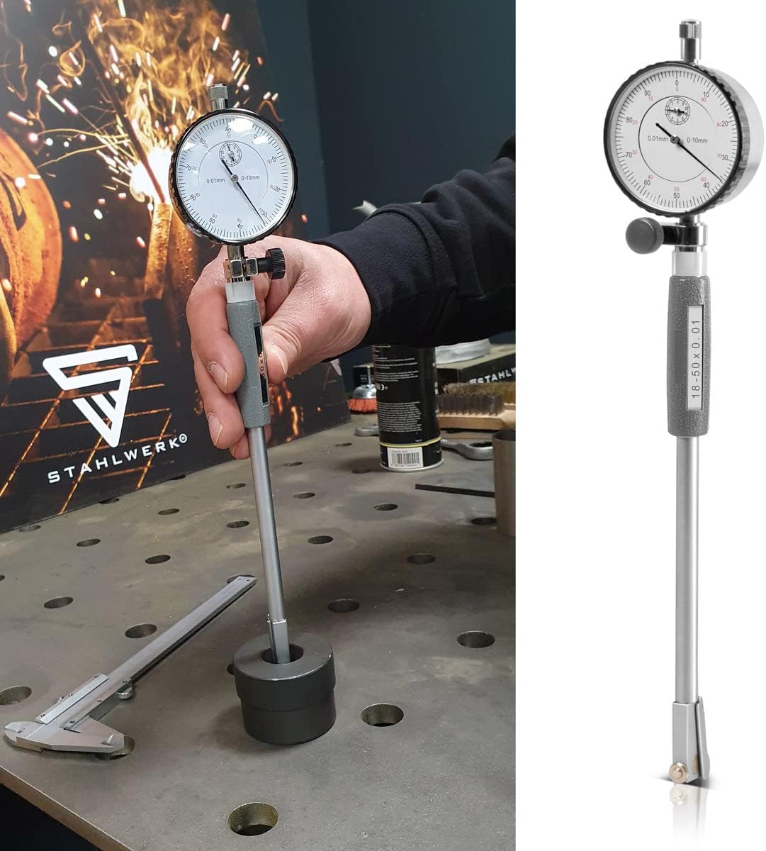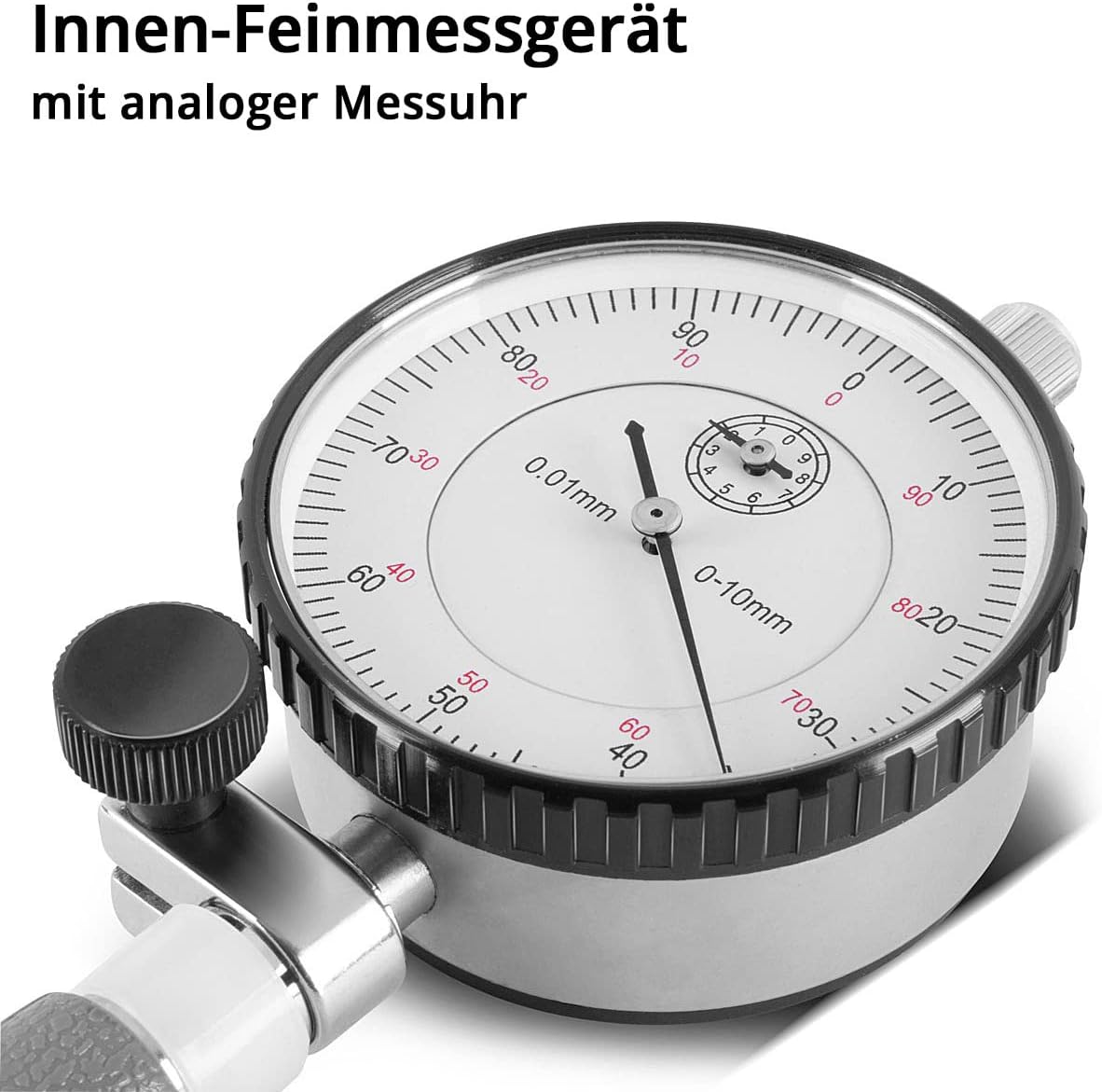 - STAHLWERK Innen-Feinmessgerät mit analoger Messuhr inklusive 7 Messbolzen in den Grössen 18, 21, 23, 26, 29, 32 und 35 mm.