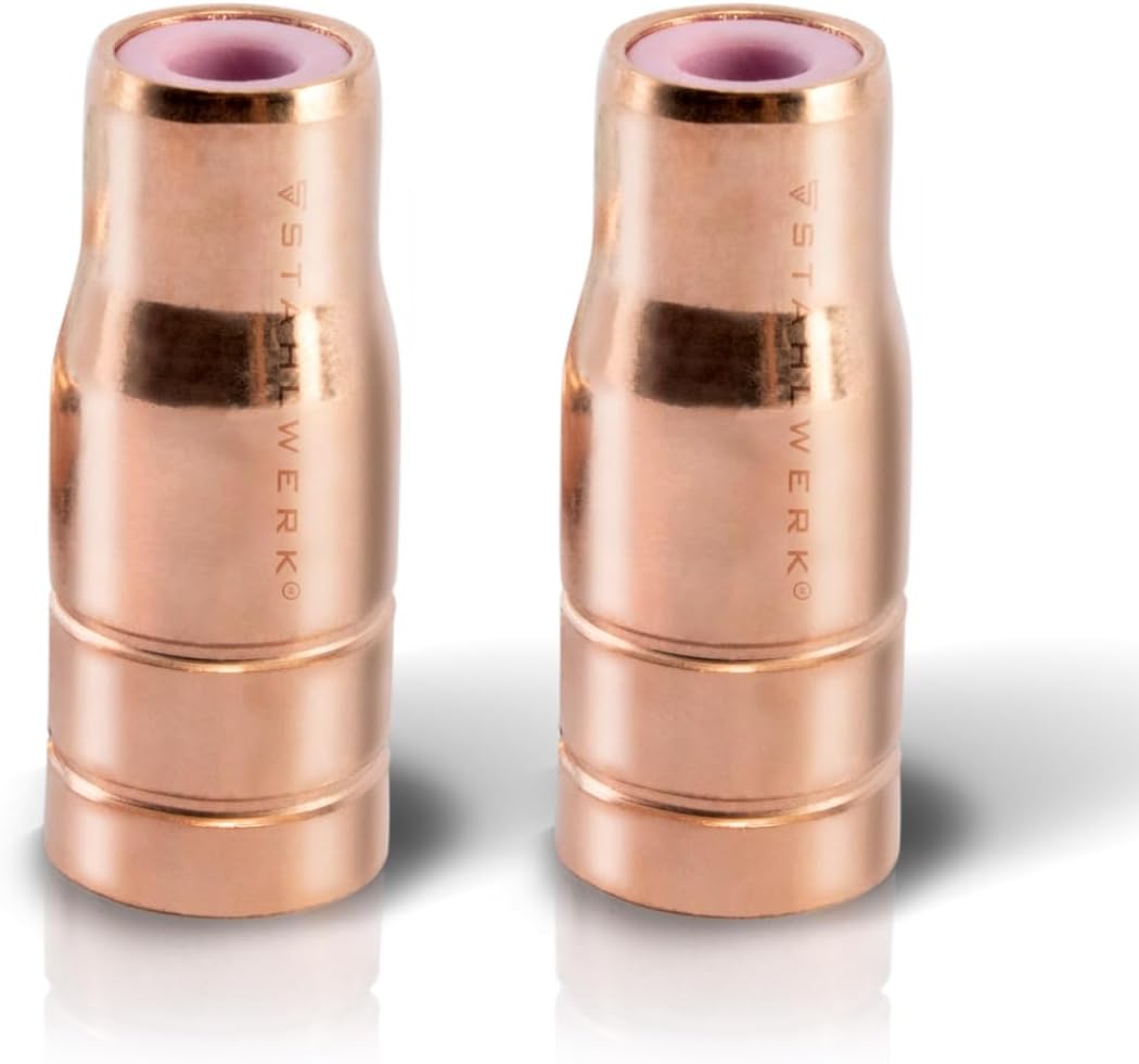 - Die Fülldrahtdüse kompensiert die Kühlung des fehlenden Schutzgases und schützt so die Stromdüse vor zu hoher Hitze. Zudem sorgt die Düse für eine erhöhte Leistungsfähigkeit und Zuverlässigkeit des Brenners. Besonders hitzebeständig und robust mit isolierendem Keramikring.