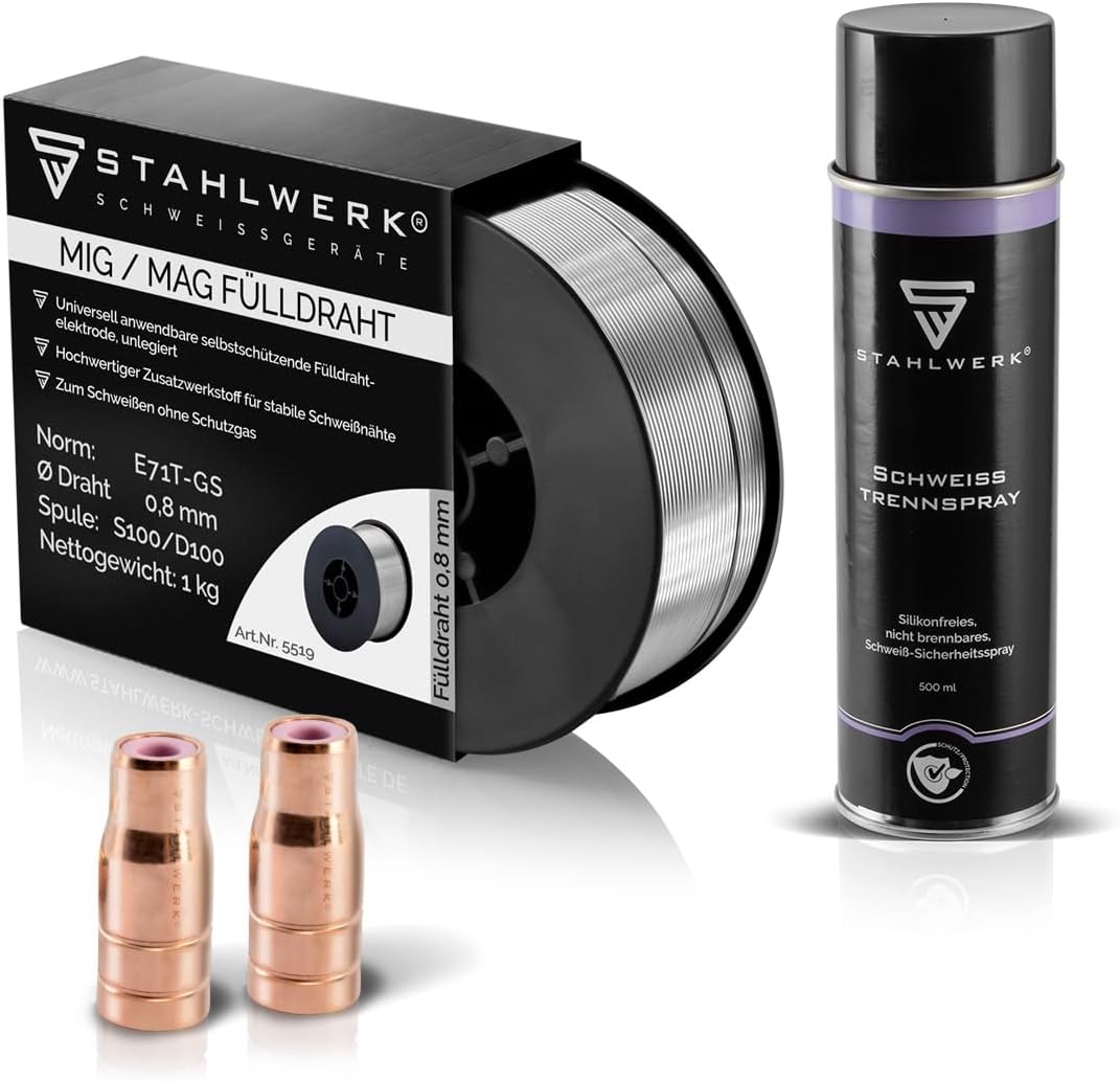 - Qualitativ hochwertiger Premium 0,8mm Fülldraht für nahezu alle MIG/MAG Geräte mit 16mm Dorn Spulenaufnahme. Universell einsetzbare, unlegierte und selbstschützende Fülldrahtelektrode für alle Stahlarbeiten ohne Schutzgas.