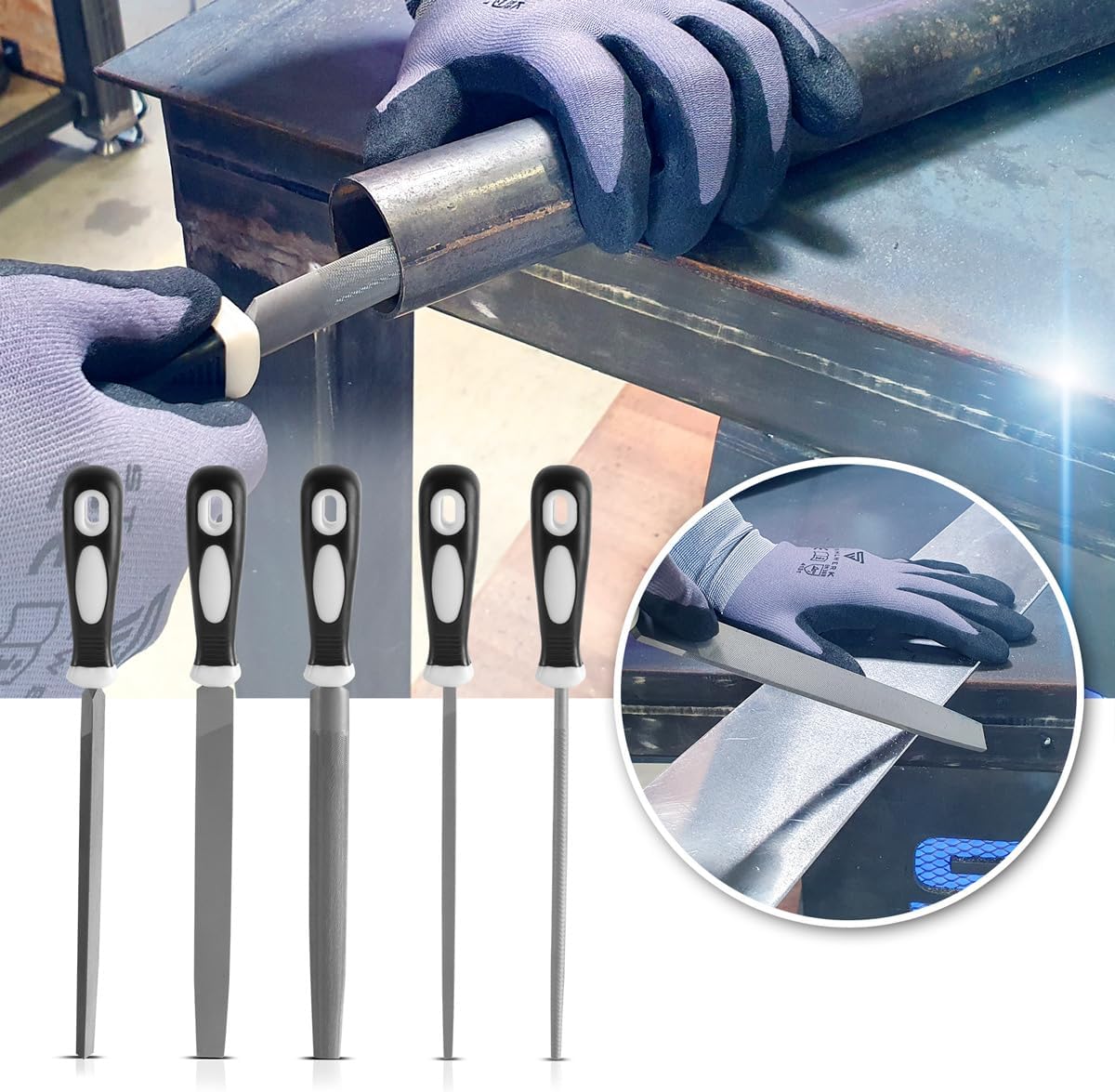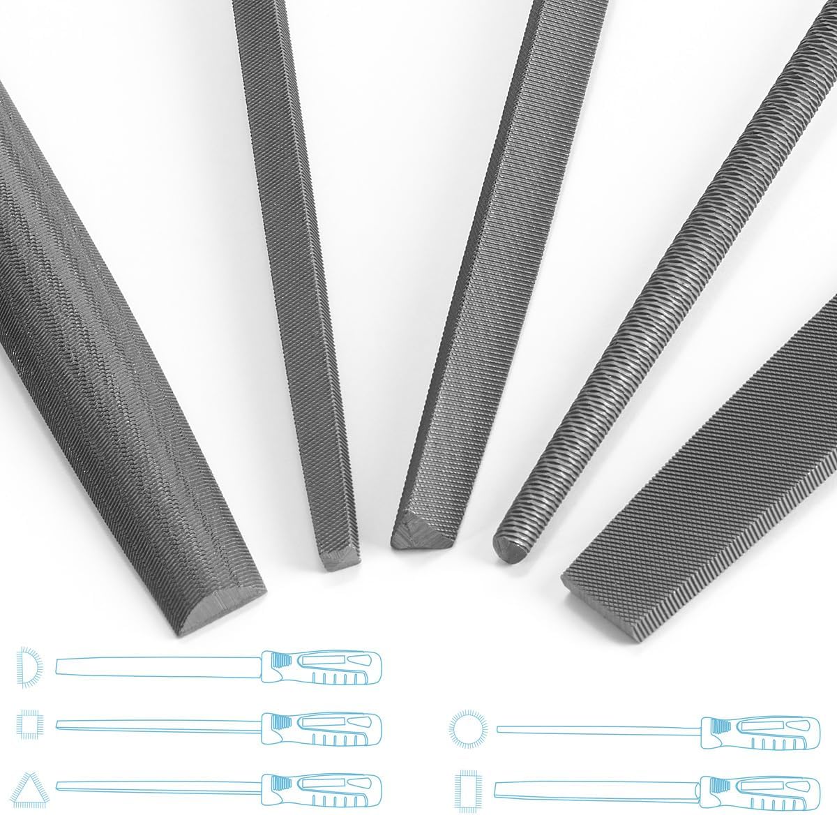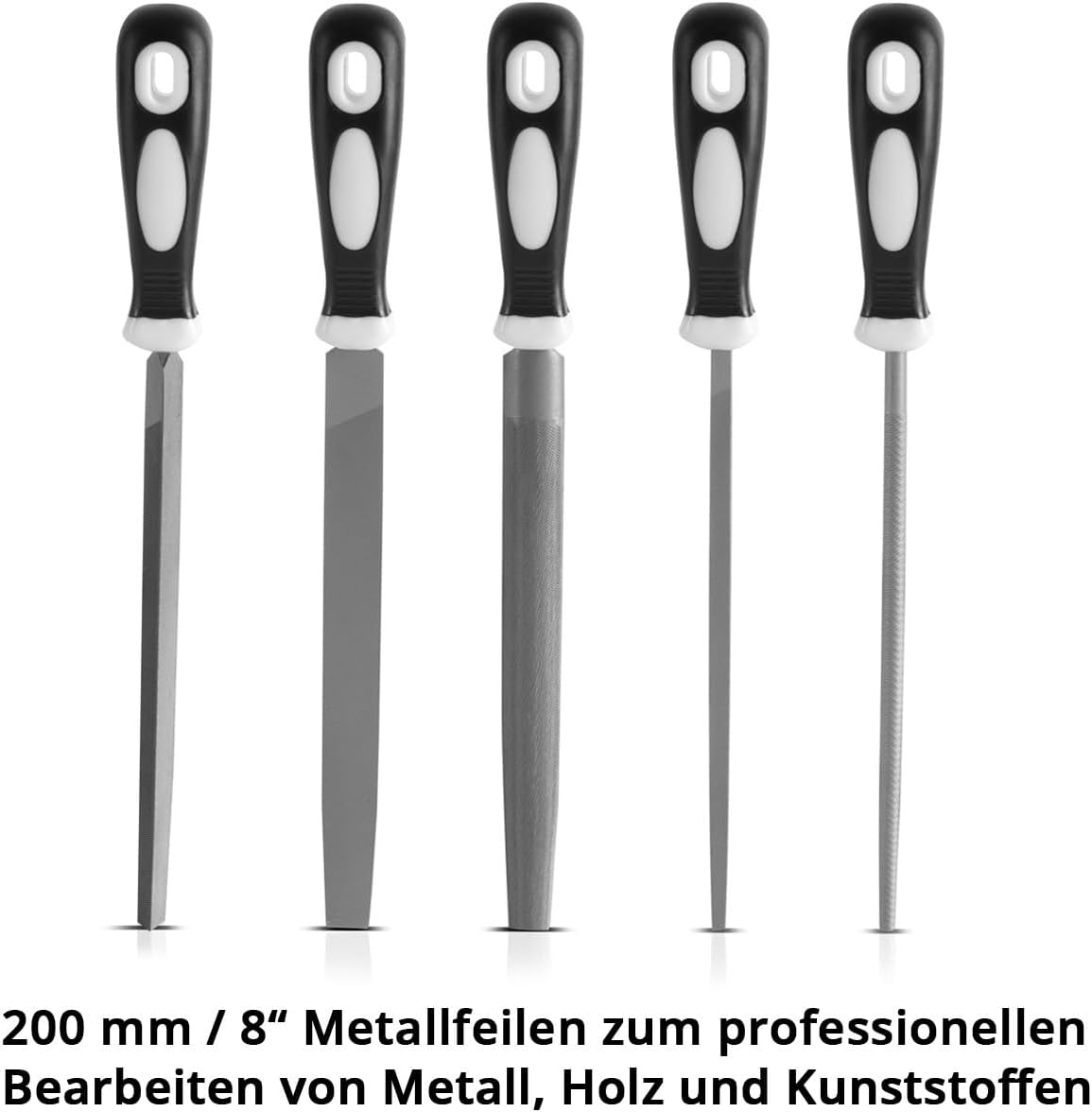 - Hochwertiges Stahlfeilen-Set mit fünf unterschiedlichen Feilen.