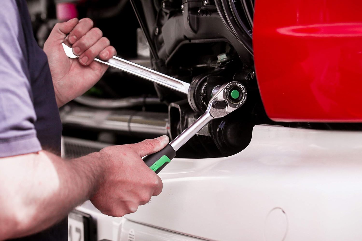 - Made in Germany – umschaltbare STAHLWILLE Knarre mit 2-Komponentengriff, 80 Zähnen, QR Druckknopf-Auslösung, Länge 265,5 mm, DIN 3122/ISO 3315, Chrome-Alloy-Steel, verchromt, 13111120