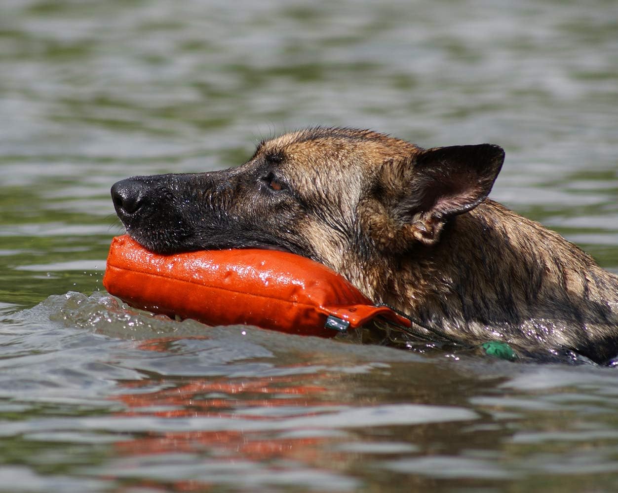 • APPORTIERÜBUNG: Als Ersatz für Wild dient der Dummy zum Training des Apportierens, also dem Zurückbringen von Gegenständen.