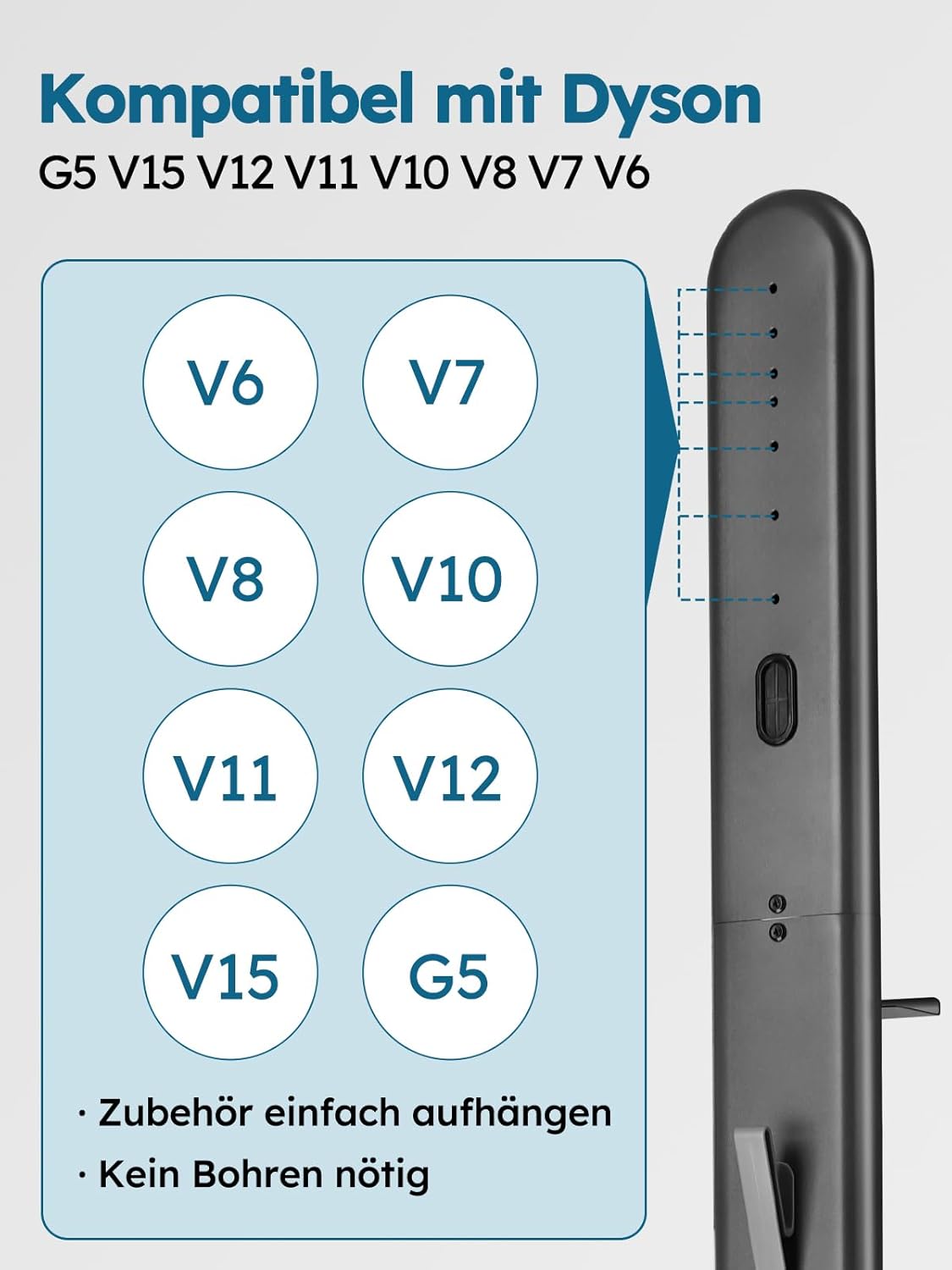 - Breite Kompatibilität: Passend für Dyson Gen5, V15, V12, V11, V10, V8, V7, V6. Ideal zur platzsparenden Aufbewahrung von Staubsauger und Zubehör. (Hinweis: Gerät und Zubehör nicht enthalten.)