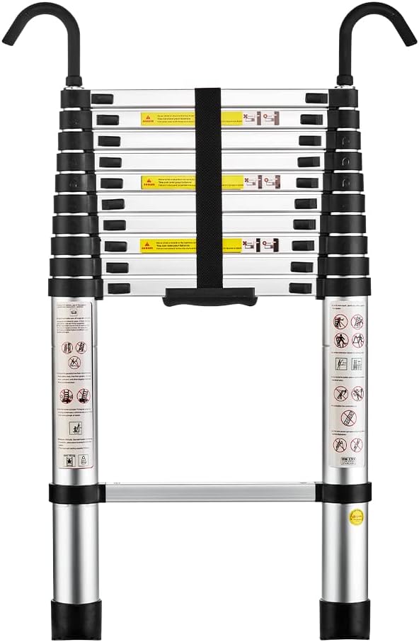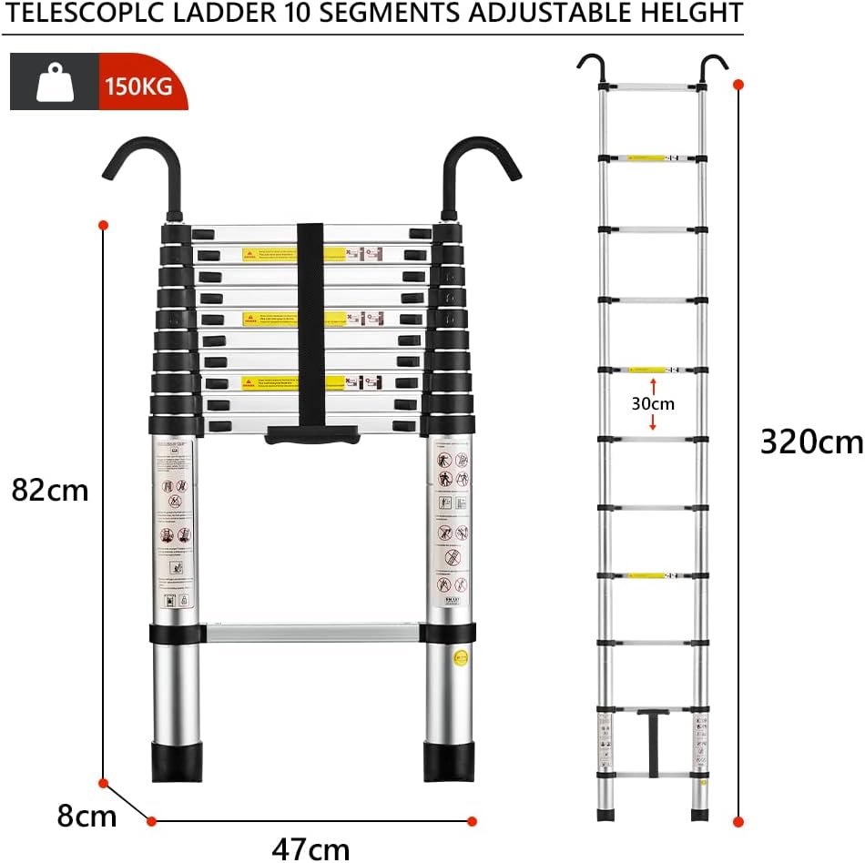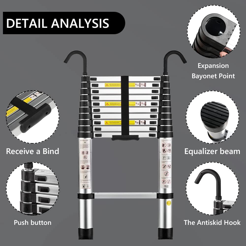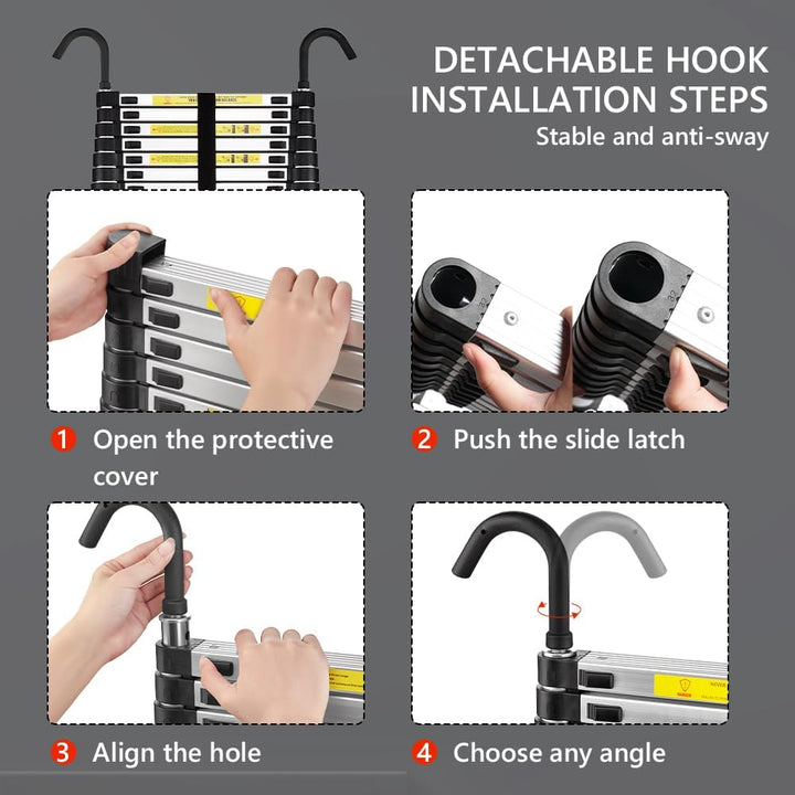 - 【Abnehmbare Haken】: Die Teleskopleiter verfügt über abnehmbare Haken, die fest an der Spitze befestigt sind, um Stabilität, Sicherheit und Komfort bei der Verwendung zu gewährleisten.