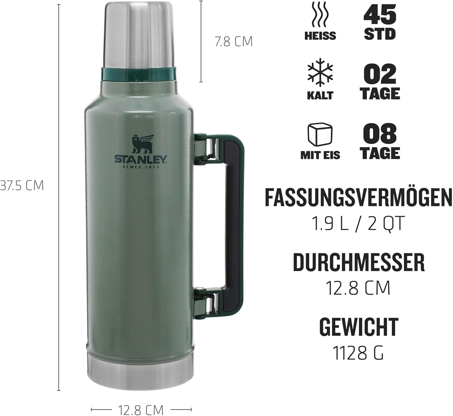 • 45 STUNDEN HEIss ODER KALT: Die Stanley vakuumisolierte Thermosflasche hält Suppe, Kaffee oder Tee bis zu 45 Stunden lang heiss oder kalt; Die Stanley Edelstahl Thermoskanne ist in verschiedenen Grössen (von 473 ml bis zu 2.3 Liter) erhältlich