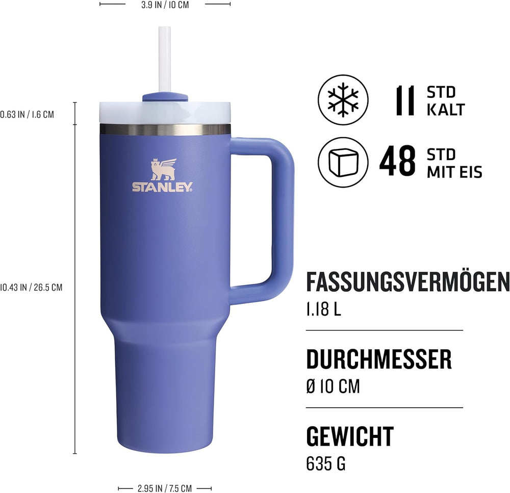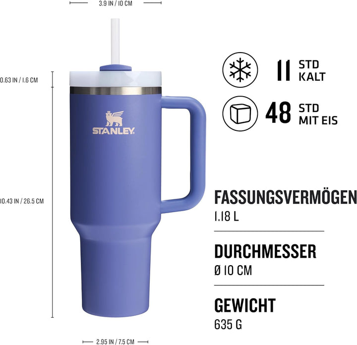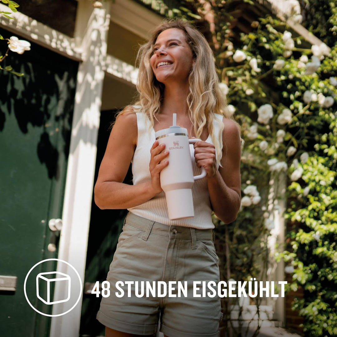 • 2 Tage eisgekühlt: Die Stanley Cup Vakuum-Isolierung hält dein Wasser 11 Stunden kalt und eiskalte Getränke bis zu 2 Tage kalt. Der Quencher Becher ist eine robuste Thermosflasche mit Deckel und Strohhalm und fasst 1,2L Wasser