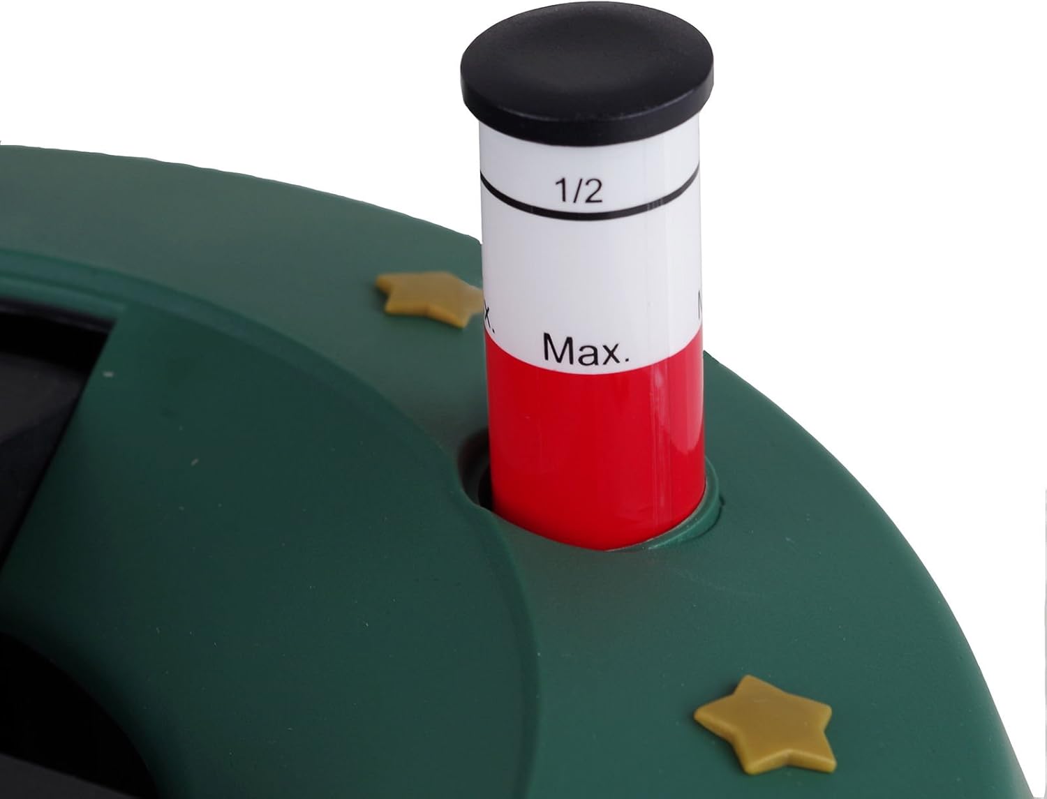 - Fusshebel- und Einseiltechnik, Vollkunststoffgehäuse, Wassertank, Wasserstandsanzeige, Öffnung zum Entleeren der Christbaumständer,