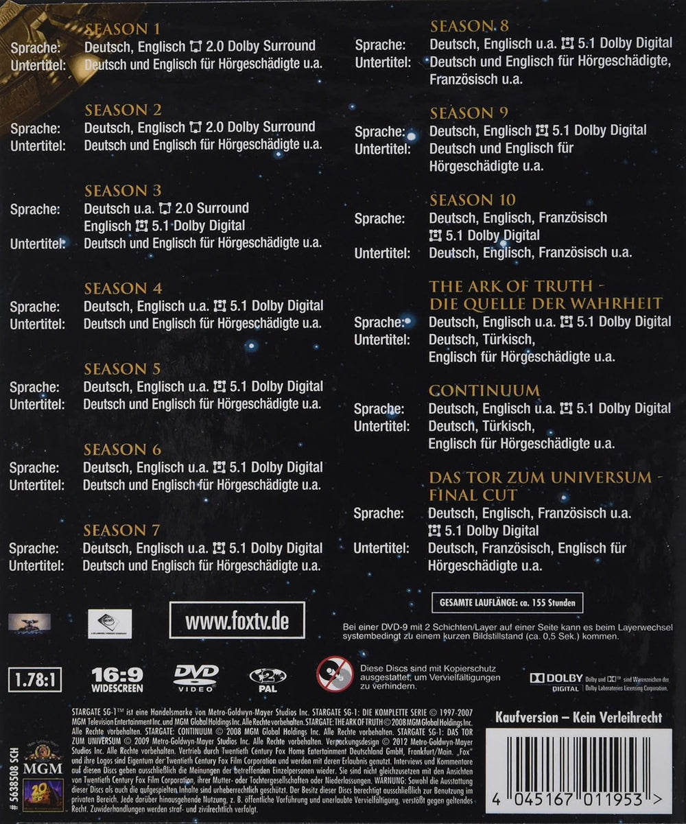 PRODUKTBESCHREIBUNGEN Geballte Stargate-Power! Alle zehn Staffeln von Stargate Kommando SG-1 mit dem gesamten Bonusmaterial komplett in einer DVD-Box. Ausserdem enthält die Box die Filme Stargate: Continuum", "The Ark of Truth", "Das Tor zum Universum" sowie eine umfangreiche Bonus-Disc! Die umfangreichen Extras beinhalten Interviews mit Stars und Machern, geben Aufschluss darüber, wie die Serie einst ins Leben gerufen wurde, gewähren Einblicke in die Entstehung der spektakulären Spezialeffekte und vieles mehr."