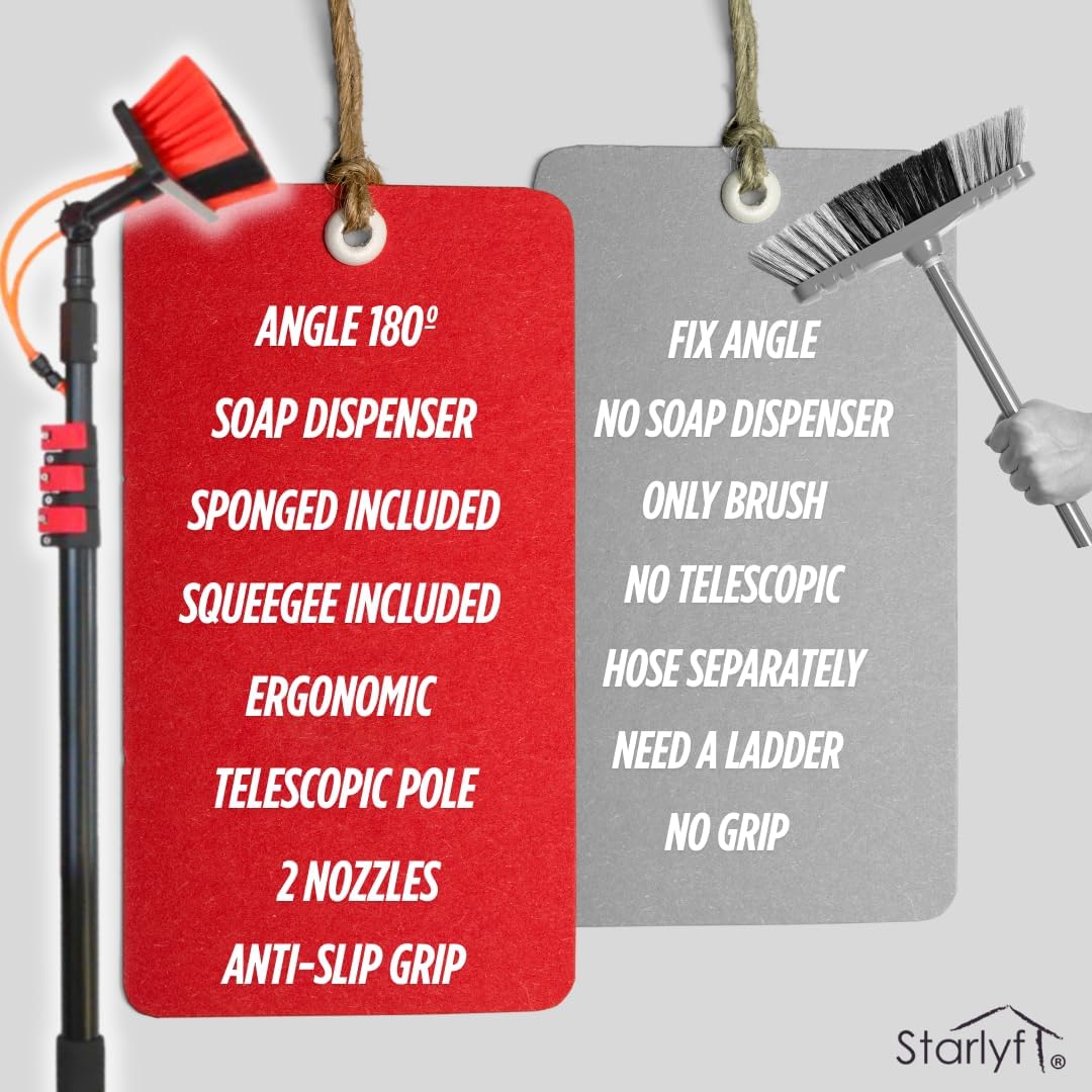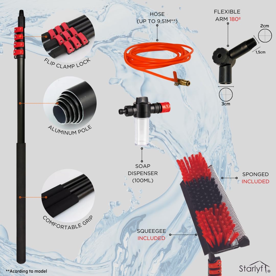 - Komplettes Set: Das Produkt beinhaltet: Teleskopgriff, Bürstenkopf mit Schwamm und Fensterreiniger, Wasserschlauch, Anschlüsse für Wasserversorgung oder Schlauch, professionellen Winkeladapter, Seifenspender und eine Bedienungsanleitung (evtl. nicht
