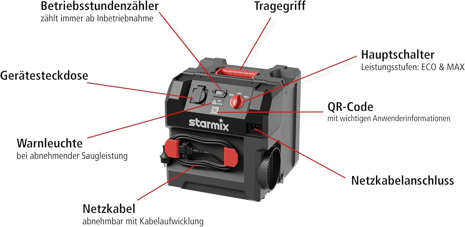- Luftreiniger für die unterschiedlichsten Baustellen: Dank Zu- & Abluftschläuchen haben Sie viele Möglichkeiten den starmix Luftreiniger für Baustaub auf den unterschiedlichsten Baustellen einzusetzen - egal ob für Umluft-Reinigung oder