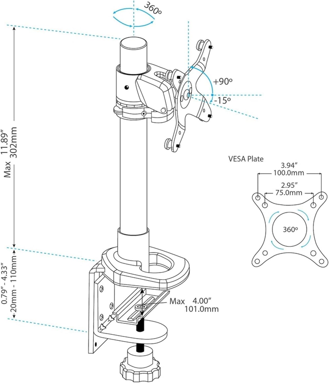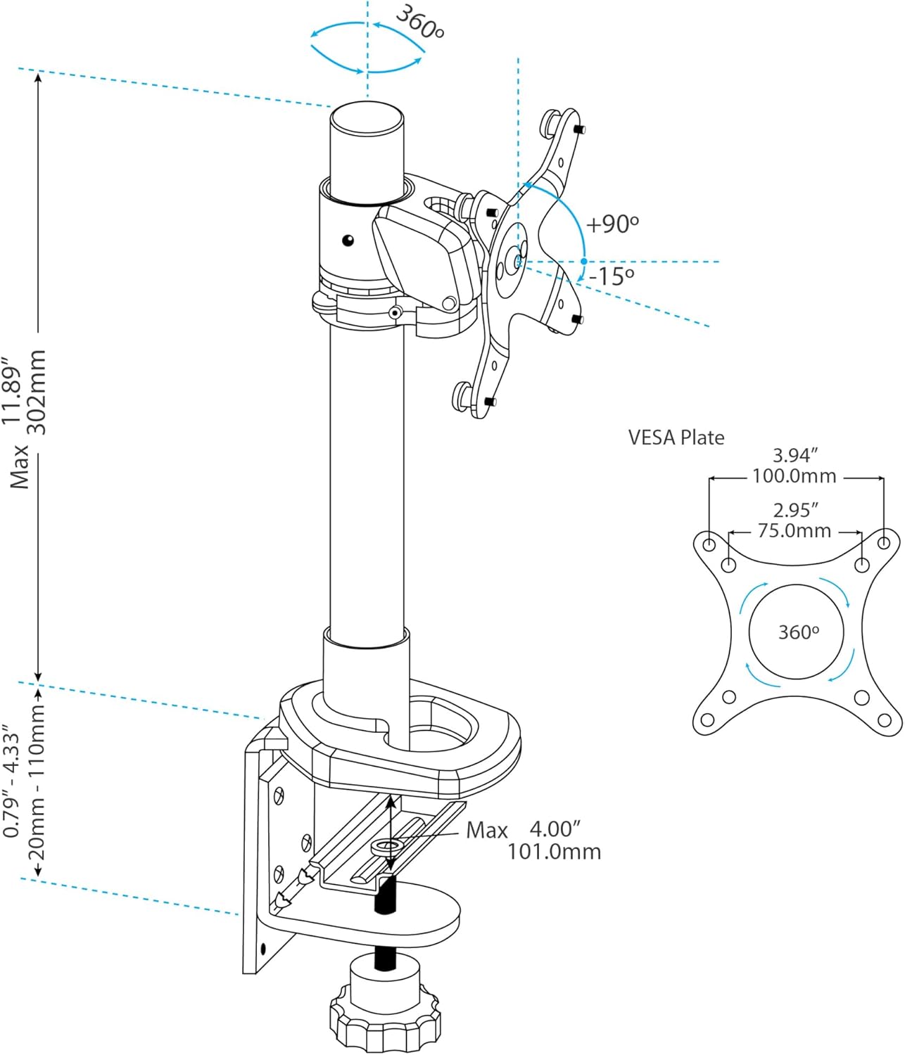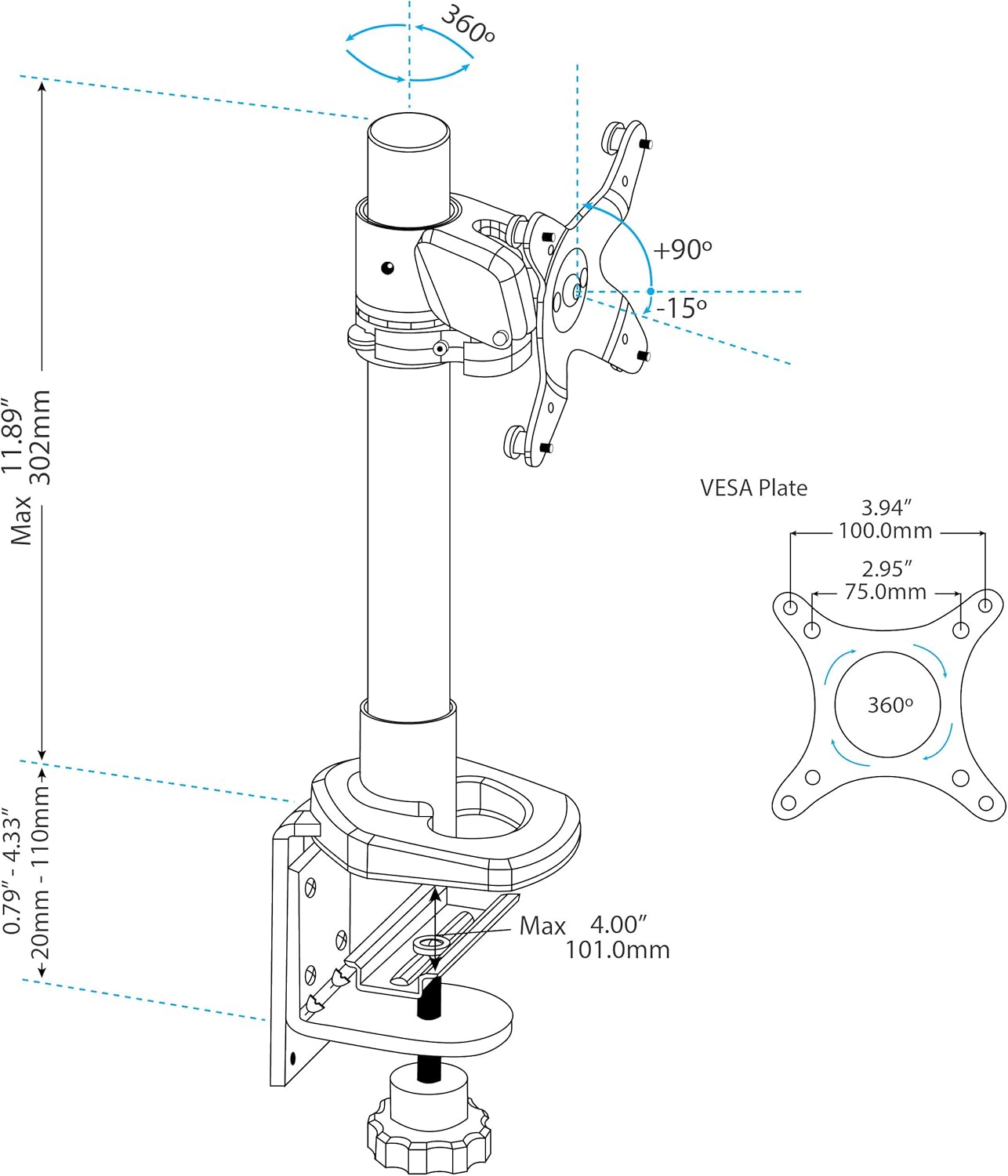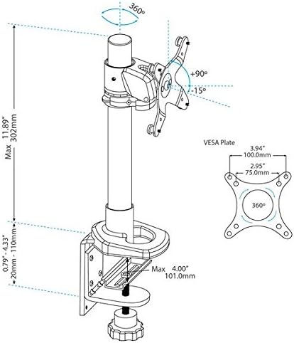 - Der Bildschirm kann im Hoch- und Querformat gedreht werden (für die Verwendung im Hochformat unterstützt die Halterung extra breite Displays mit einer maximalen Breite von 45,2 cm)