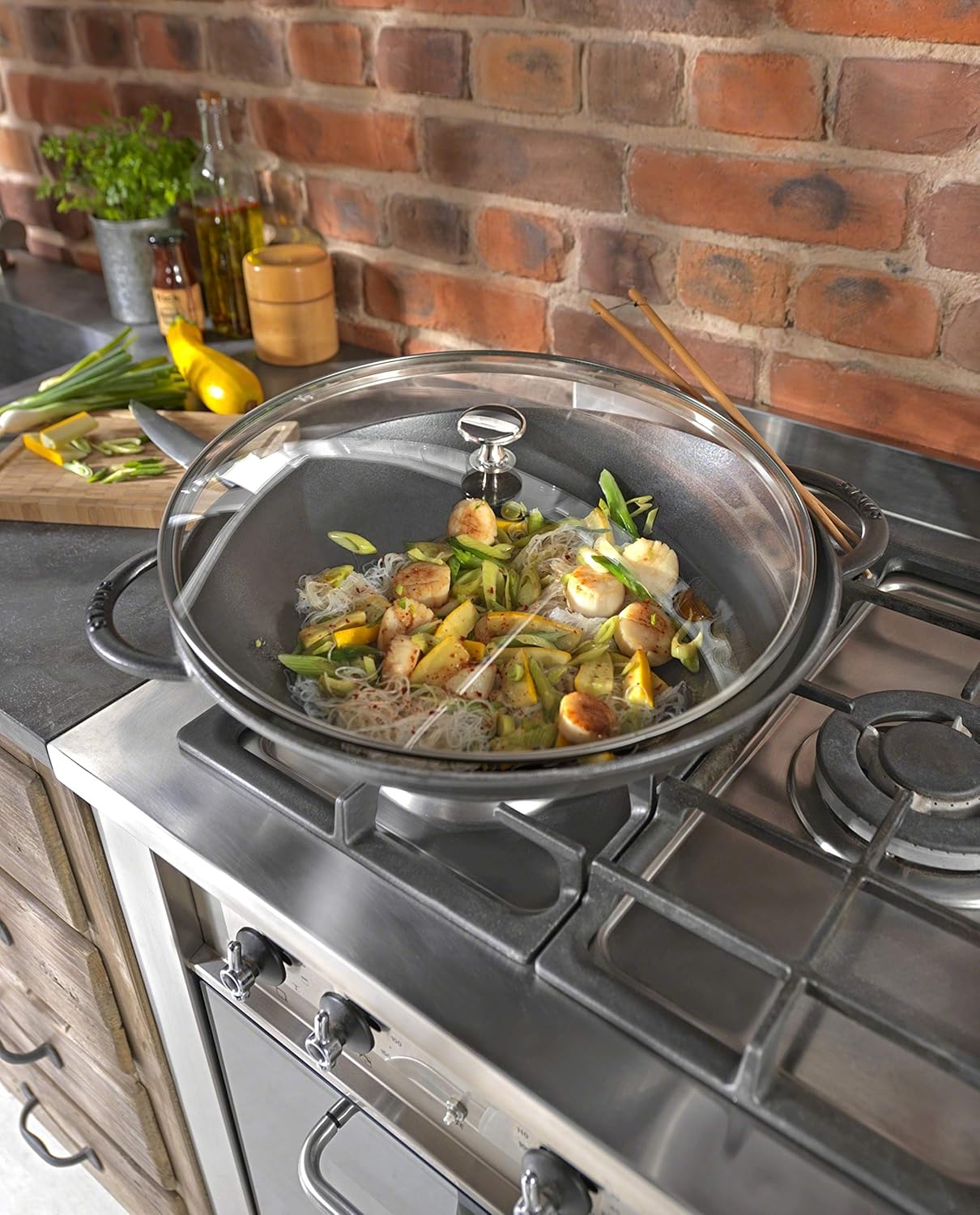 - Multifunktionaler Wok aus Gusseisen mit passendem Glasdeckel und Gittereinsatz für alle Herdarten einschliesslich Induktionsherd, Ideal geeignet zum Schmoren, Dämpfen und Frittieren von Fleisch, Fisch und Gemüse