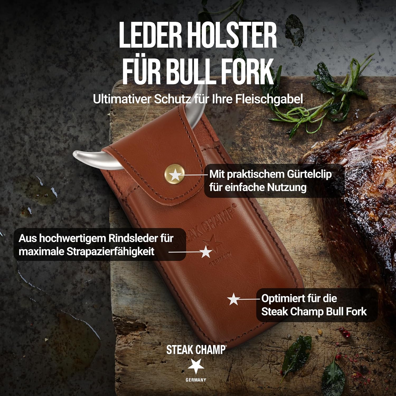 - HOCHWERTIGES MATERIAL: Das Steak Champ Lederholster für die Bull Fork Fleischgabel besteht aus dickem und hochwertigem Rindsleder, das eine hohe Strapazierfähigkeit und Langlebigkeit gewährleistet