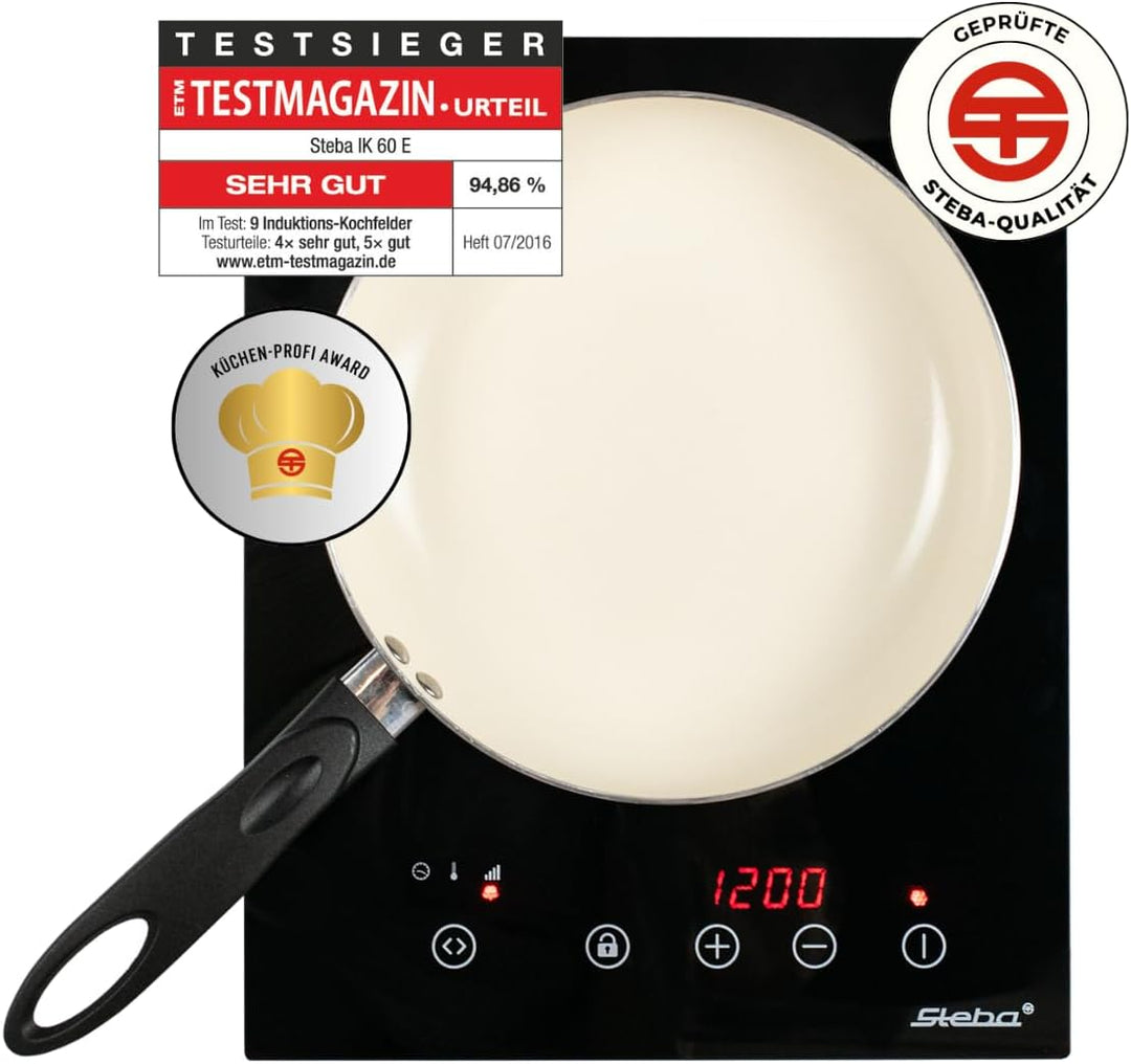 - Sicherheit: Autom. Topferkennung, Abschaltung ohne Topf, Nur der Topfboden wird direkt erhitzt, Kindersicherung