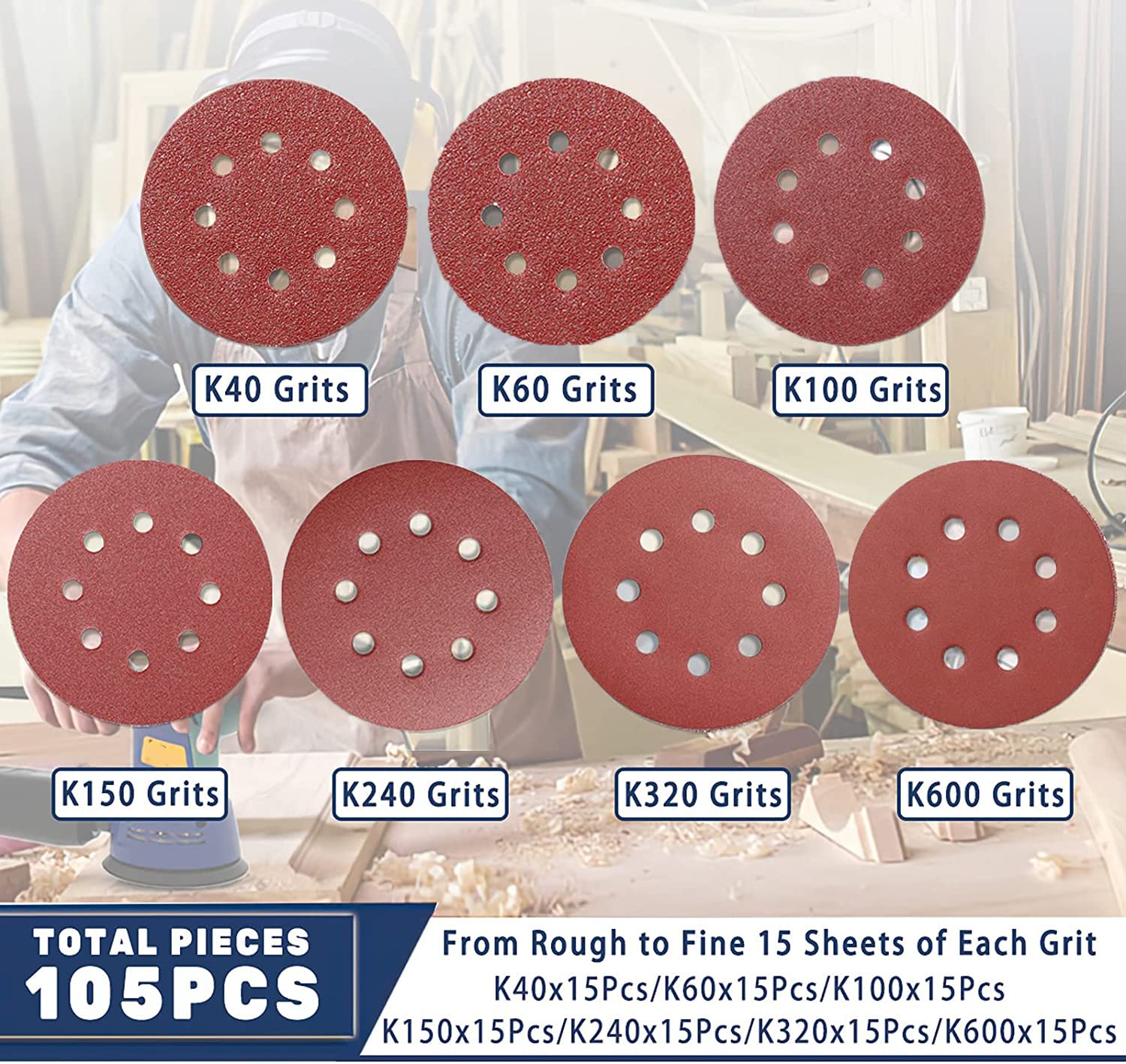- ✅【105 Stück ø 125 mm schleifpapier rund Set】15x P40/P60 /P100 /P150 /P240/P320/P600,7 verschiedene Qualitäten, Schleifpapier tvon rau bis fein, um fast alle Ihre Polieranforderungen zu erfüllen